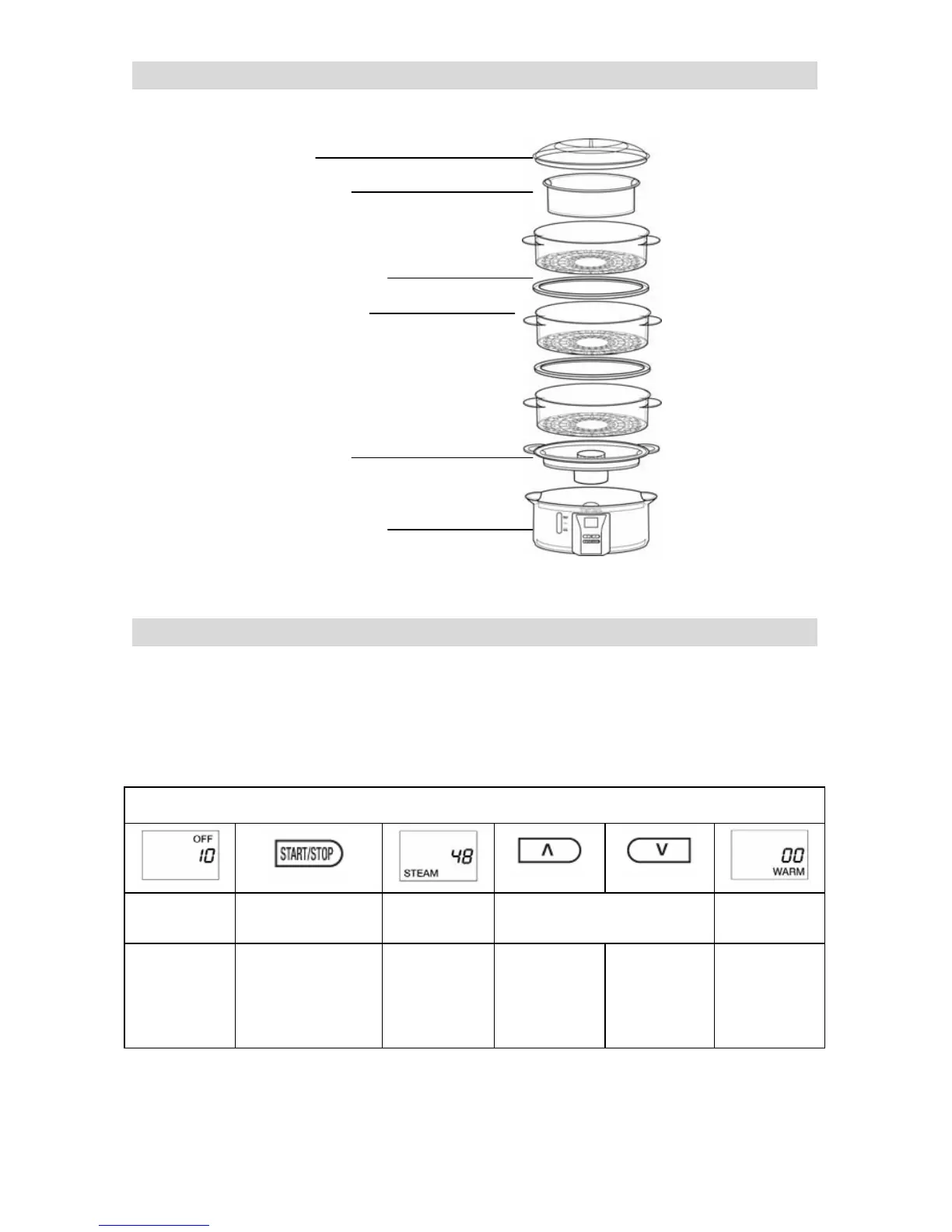 “OFF” “START/STOP” “STEAM” “STEAM TIME” “WARM”