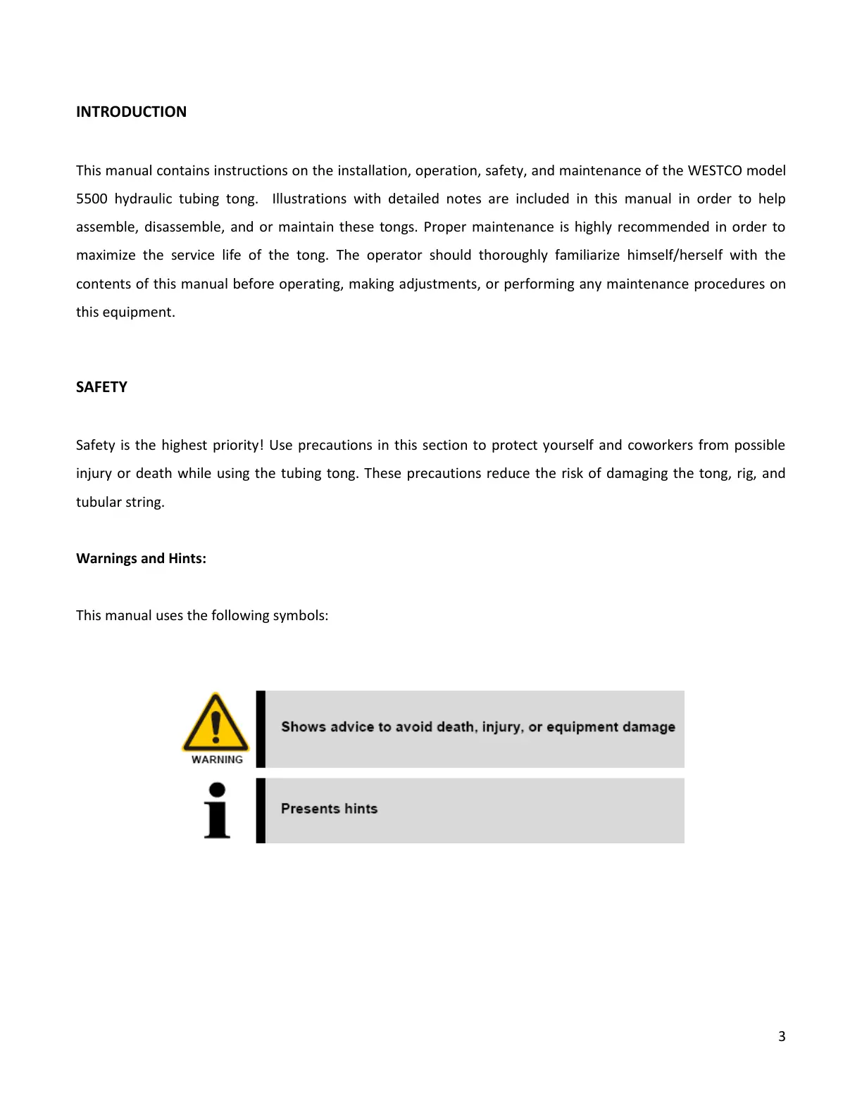 This manual contains instructions on the installation, operation, safety, and maintenance of the WESTCO model