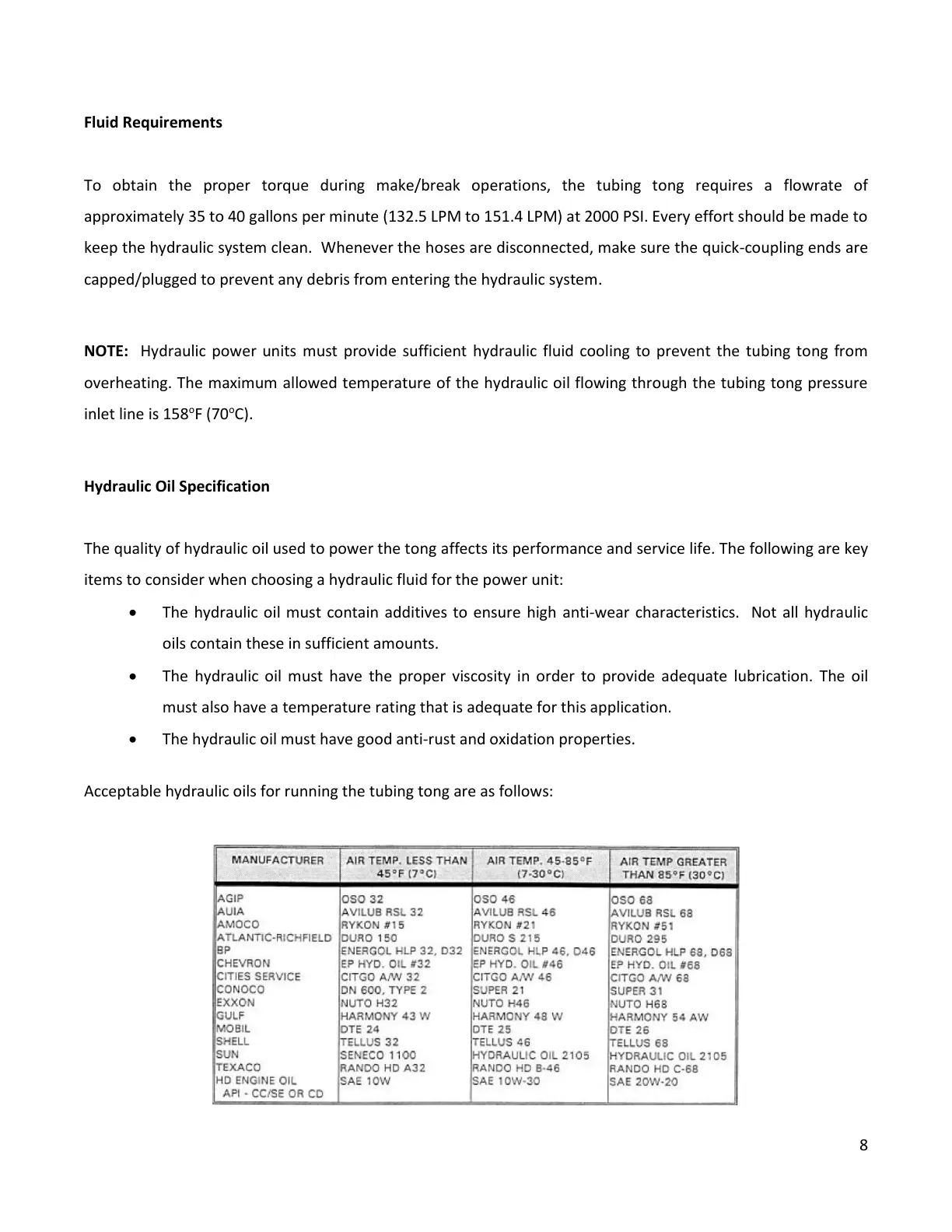 Acceptable hydraulic oils for running the tubing tong are as follows: