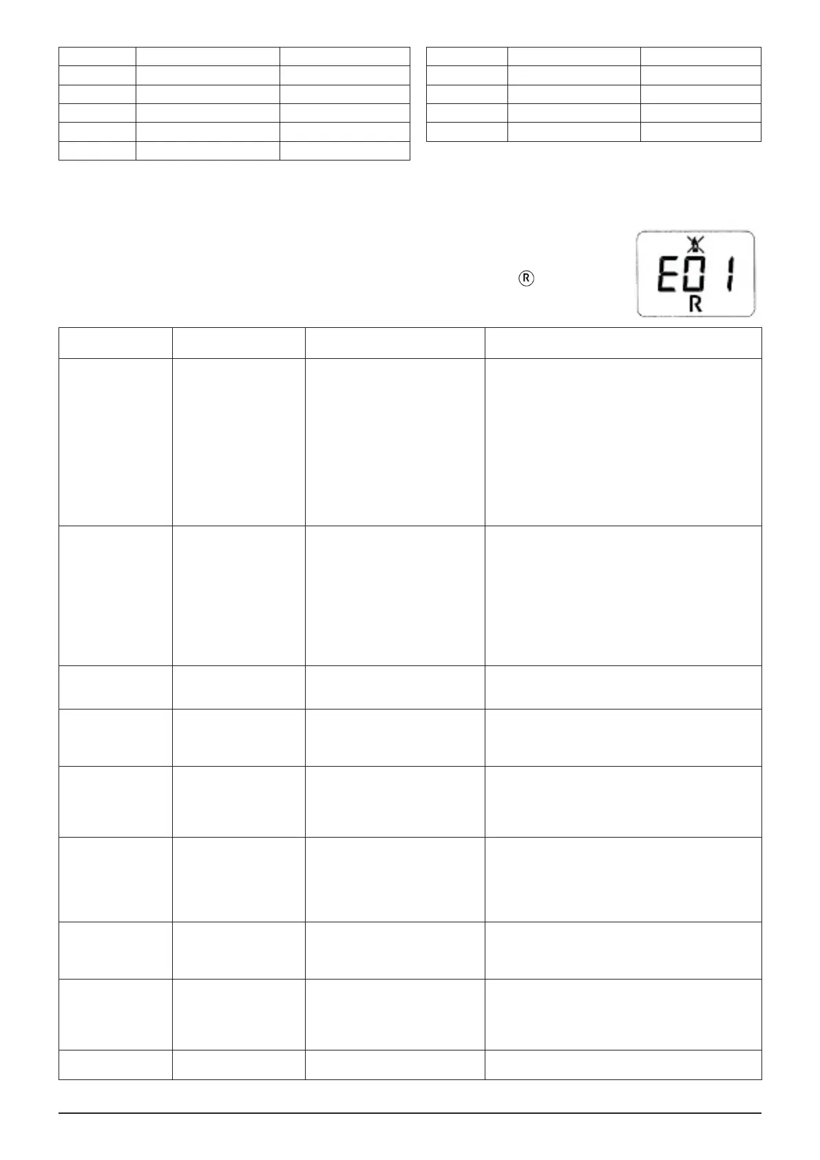 A hibákat a kijelzőn megjelenő "E" szimbólum és egy szám (hibakód) jelzi. A hibák teljes listája az