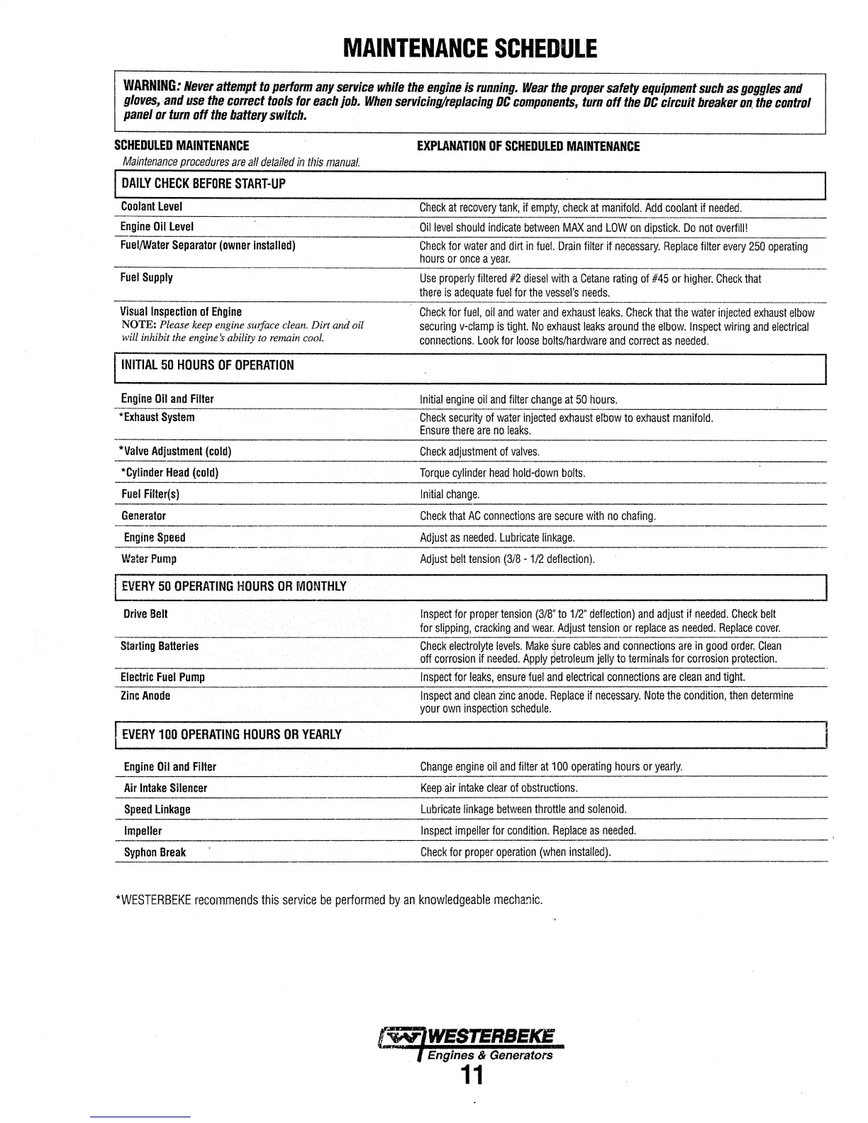 Westerbeke 12.5 BTDA - Maintenance Schedule; Daily Checks Before Start-Up; Initial 50 Hours of Operation Maintenance; Every 50 Operating Hours or Monthly Maintenance