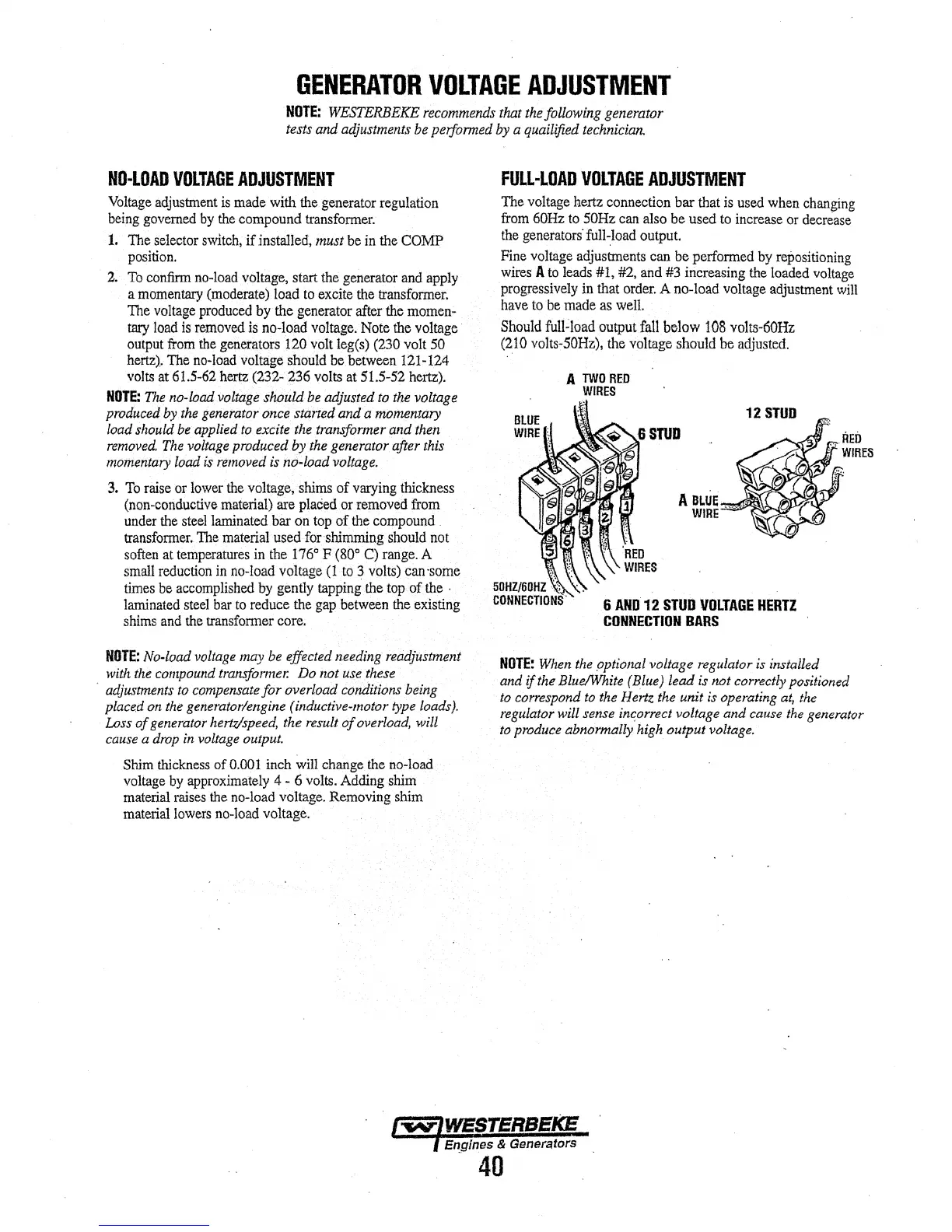 Westerbeke 12.5 BTDA - Generator Voltage Adjustment; No-Load Voltage Adjustment; Full-Load Voltage Adjustment