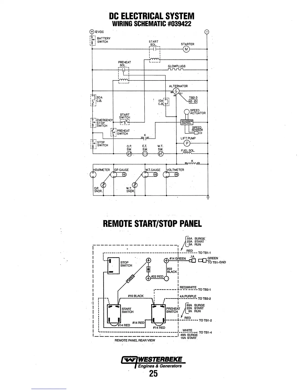 Westerbeke 20.0 BEDA - DC Electrical System Wiring Schematic; Remote Start;Stop Panel