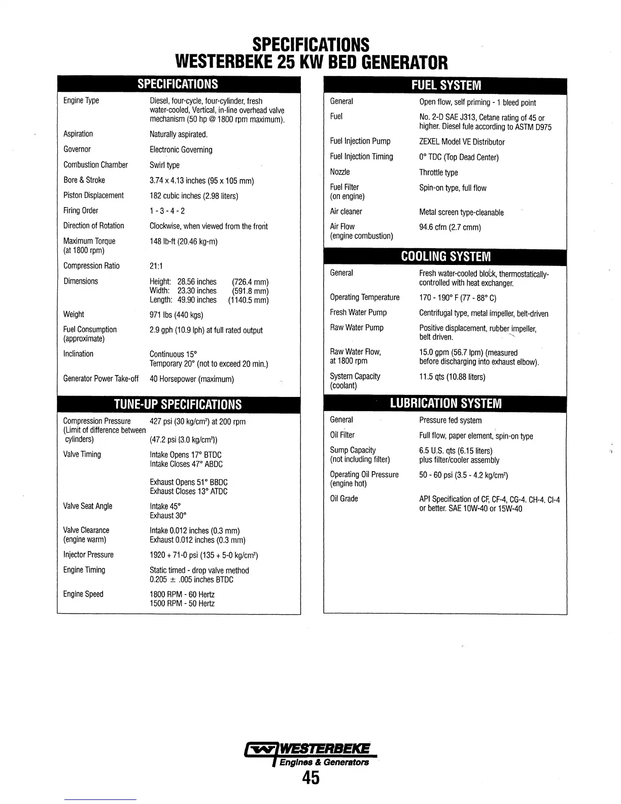 Westerbeke 20.0 BEDA - 25 KW BED Generator Specifications; Engine and General Specs; Fuel System Specs; Cooling System Specs