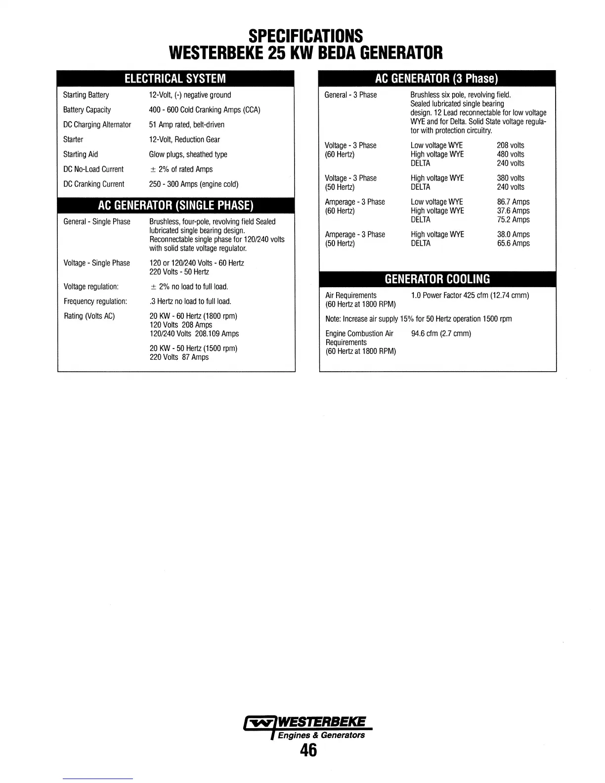 Westerbeke 20.0 BEDA - Electrical System Specs; AC Generator (3 Phase) Specs; AC Generator (Single Phase) Specs; Generator Cooling Specs