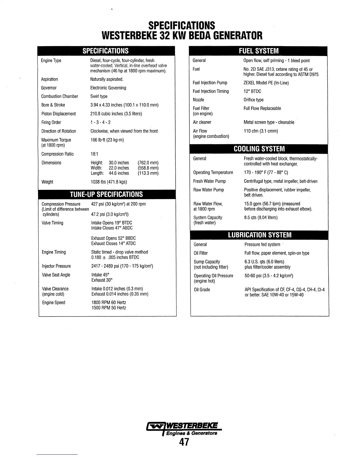 Westerbeke 20.0 BEDA - 32 KW BEDA Generator Specifications; Engine and General Specs; Fuel System Specs; Cooling System Specs
