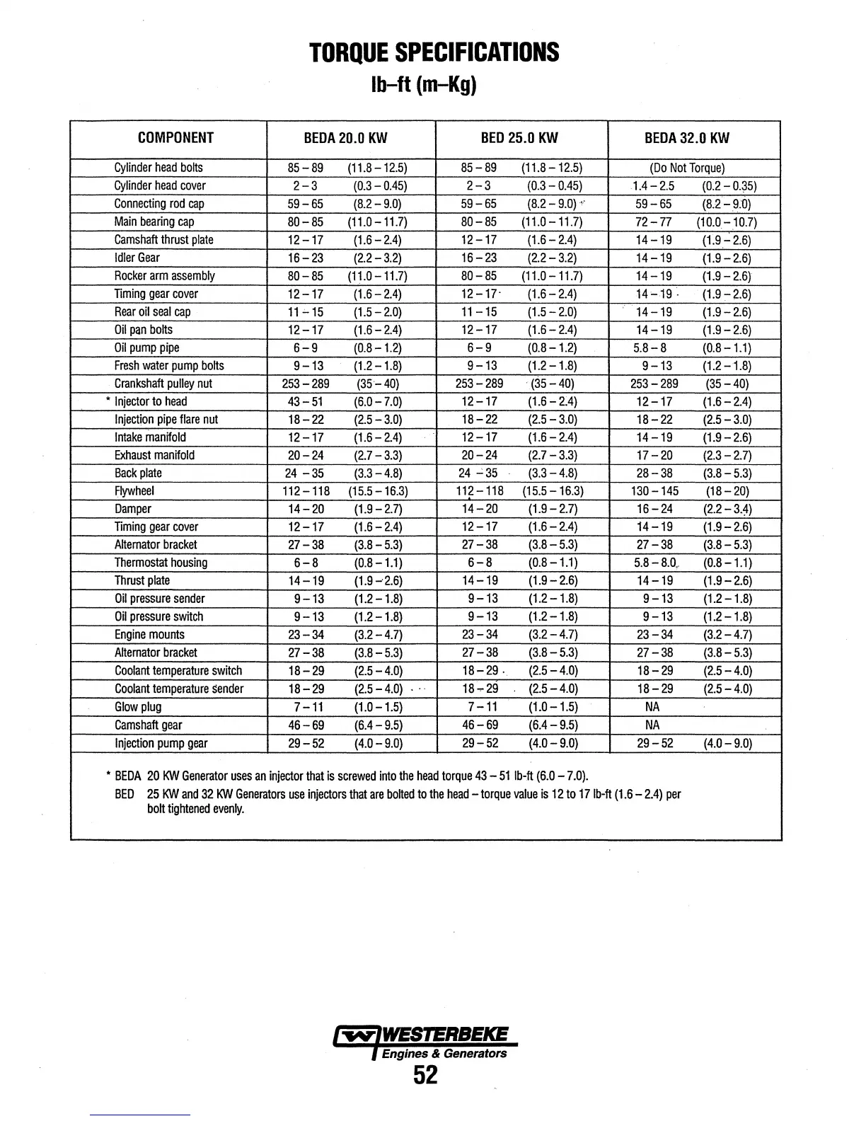 Westerbeke 20.0 BEDA - Torque Specifications; 20.0 KW BEDA Torque Specs; 25.0 KW BED Torque Specs; 32.0 KW BEDA Torque Specs