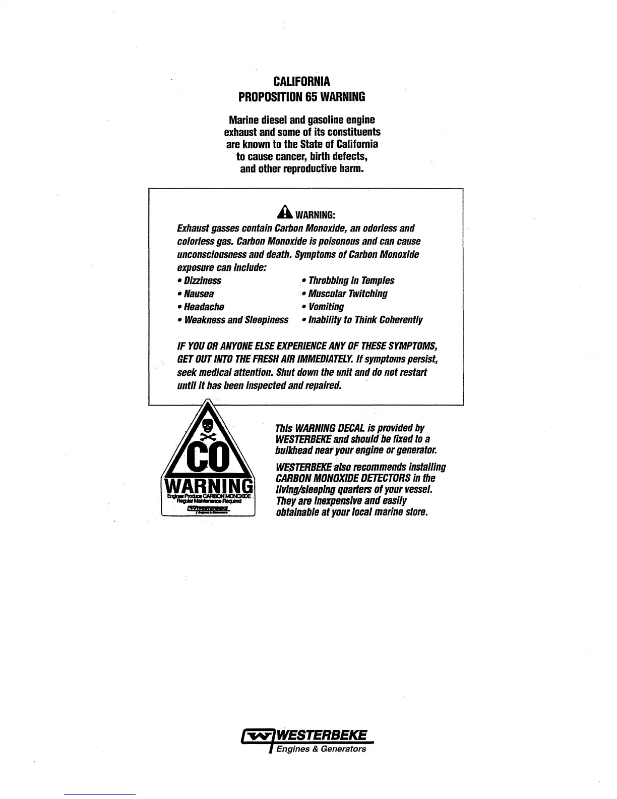 Westerbeke 3.0 BPMG - California Proposition 65 Warning; Carbon Monoxide (CO) Safety