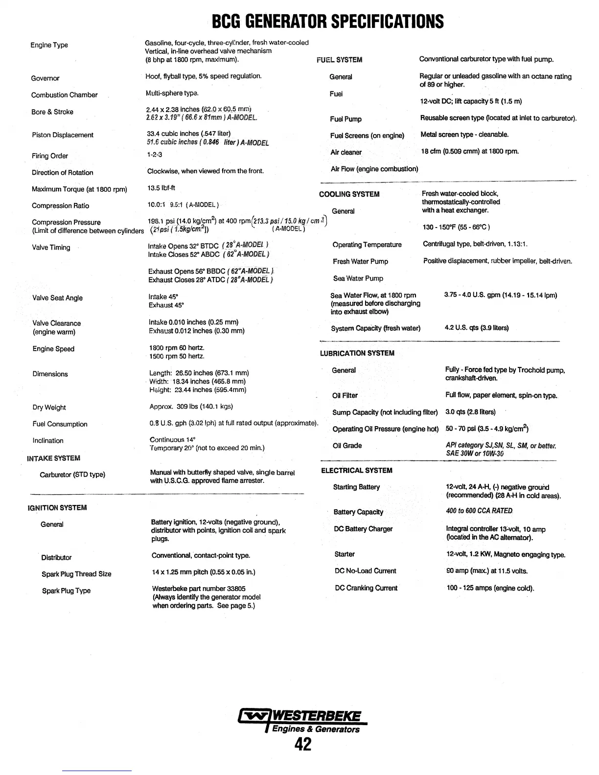 Westerbeke 4.5 BCG - BCG Generator Specifications; Engine Type and Governor; Fuel System Specifications; Cooling System Specifications