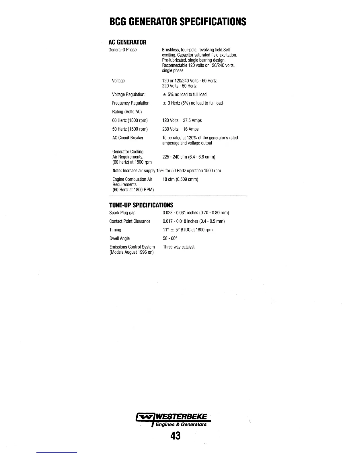 Westerbeke 4.5 BCGA - BCG GENERATOR SPECIFICATIONS (CONTINUED); AC GENERATOR AND TUNE-UP SPECIFICATIONS