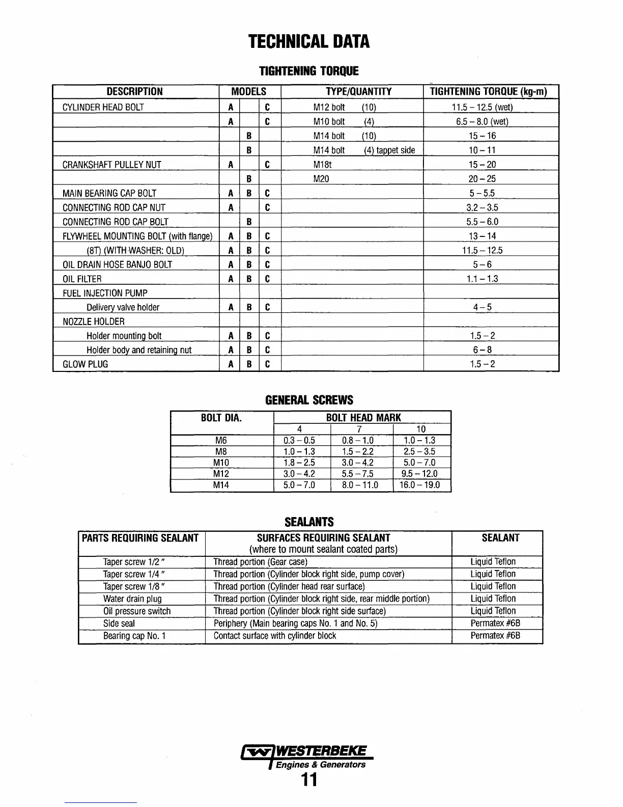 Westerbeke 42B FOUR - Technical Data; Tightening Torque; General Screws; Sealants