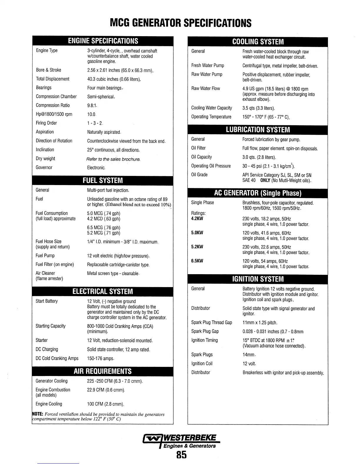 Westerbeke 6.5 MCG - MCG GENERATOR SPECIFICATIONS; ENGINE SPECIFICATIONS; COOLING SYSTEM; FUEL SYSTEM