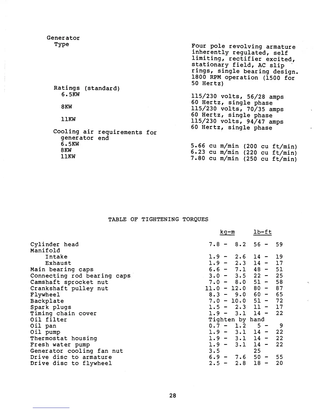 Westerbeke 6.5KW - Table of Tightening Torques