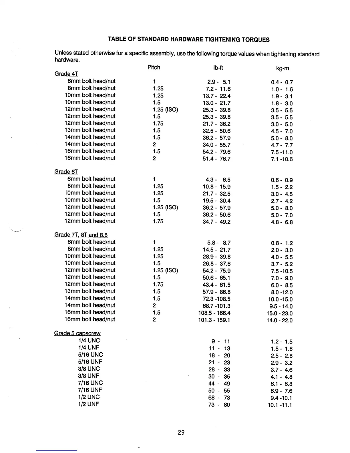 a specific assembly, use the following torque values when tightening standard
