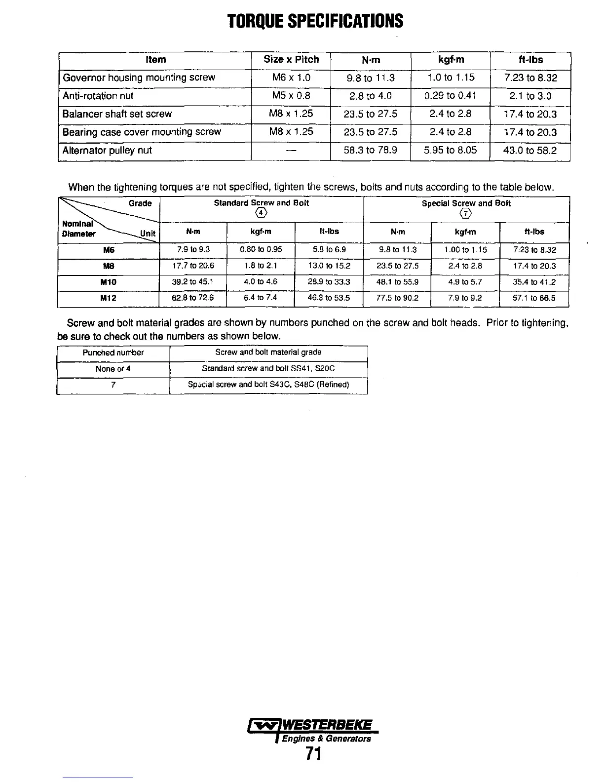 not specified, tighten the screws, bolts and nuts according to the table below.