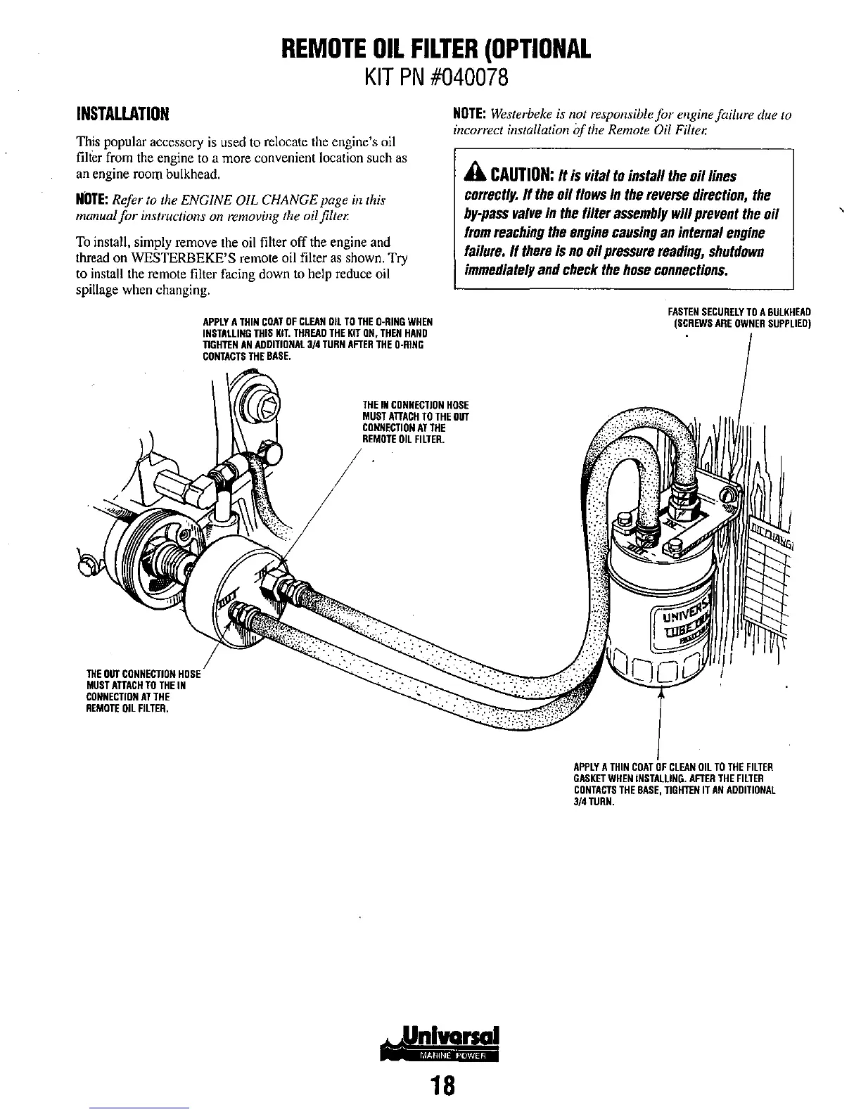 Westerbeke m-35B - REMOTE OIL FILTER (OPTIONAL); Remote Oil Filter Installation and Cautions