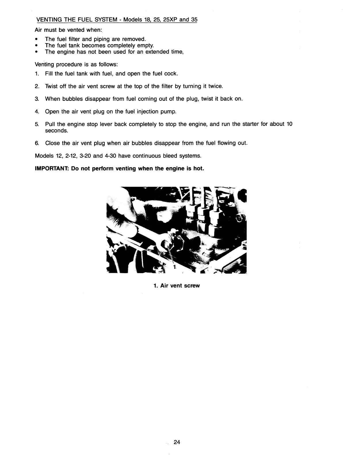 Close the air vent plug when air bubbles disappear from the fuel flowing out.