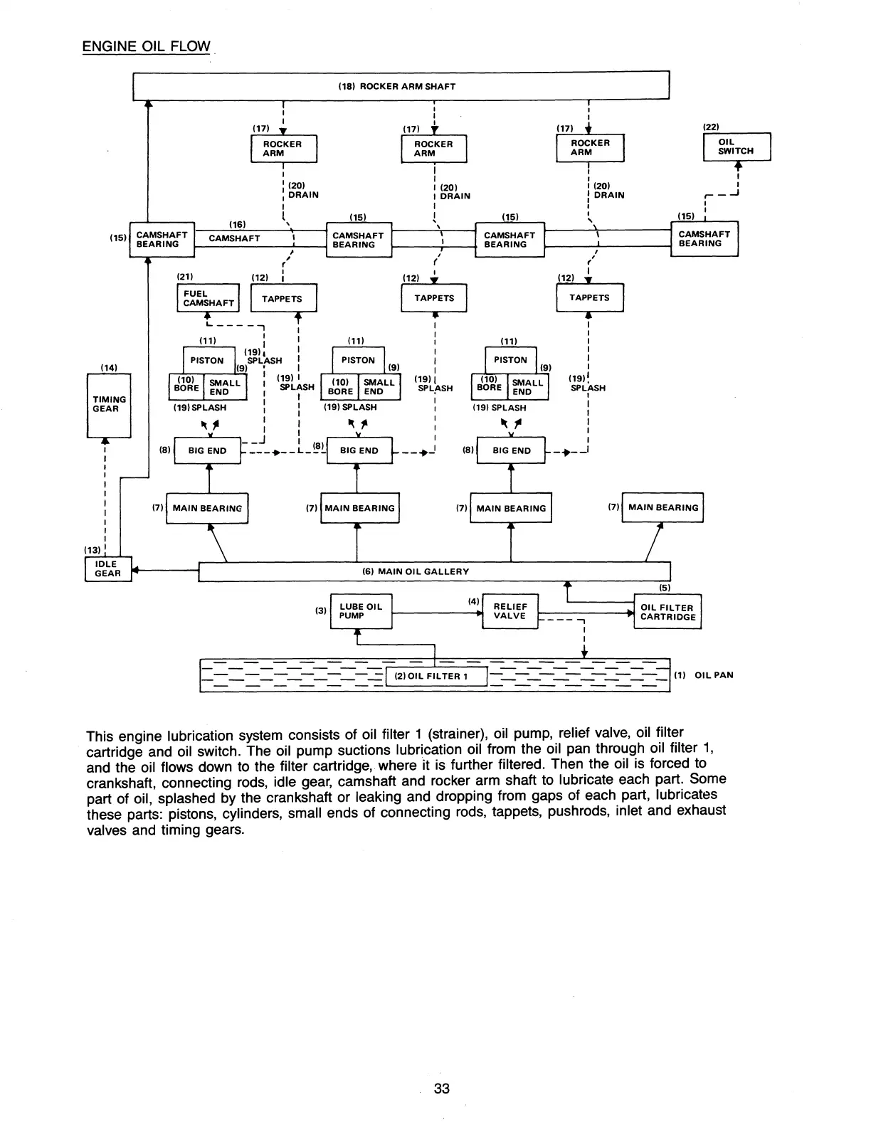 crankshaft, connecting rods, idle gear, camshaft and rocker arm shaft to lubricate each part.