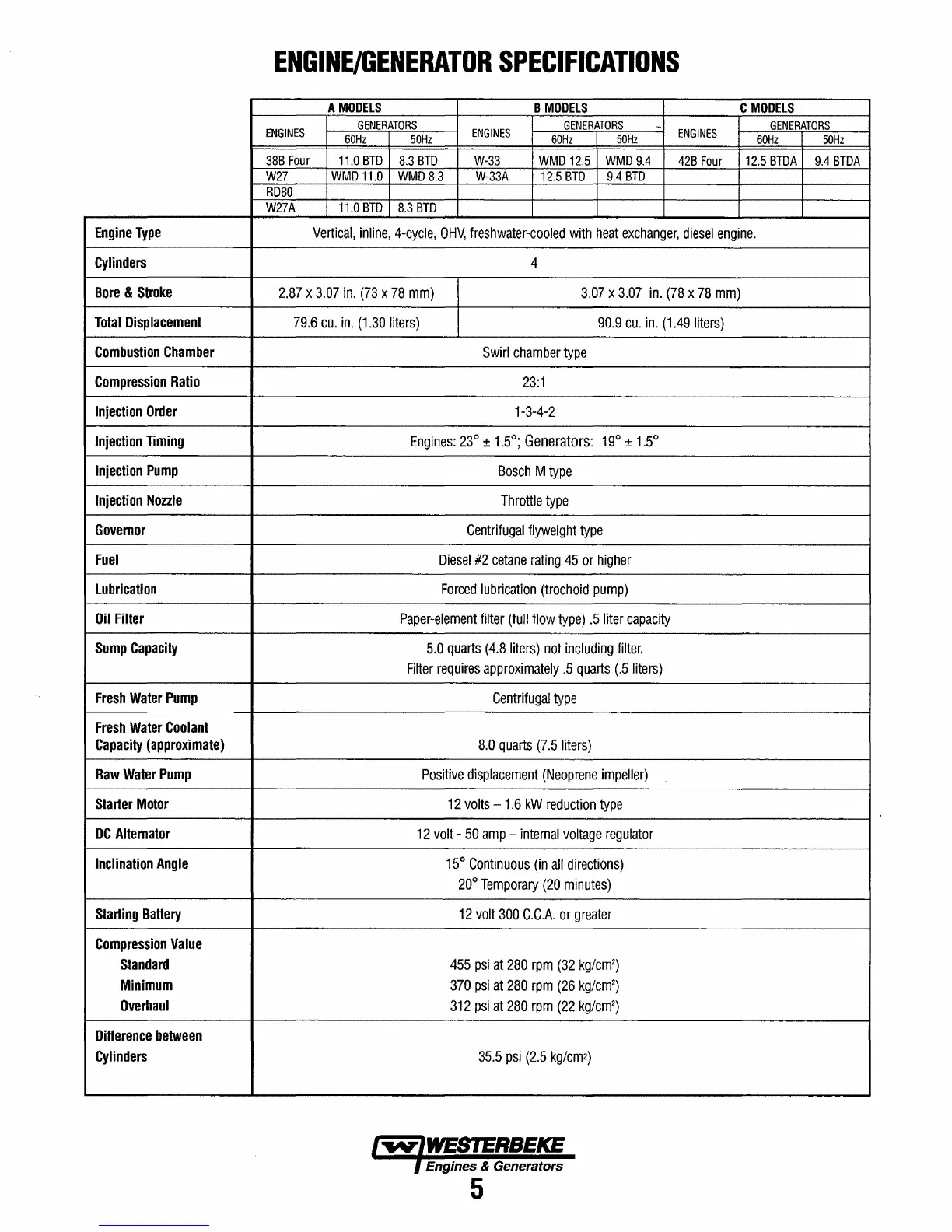 Westerbeke W-27A - Engine and Generator Specifications; Model Specification Table
