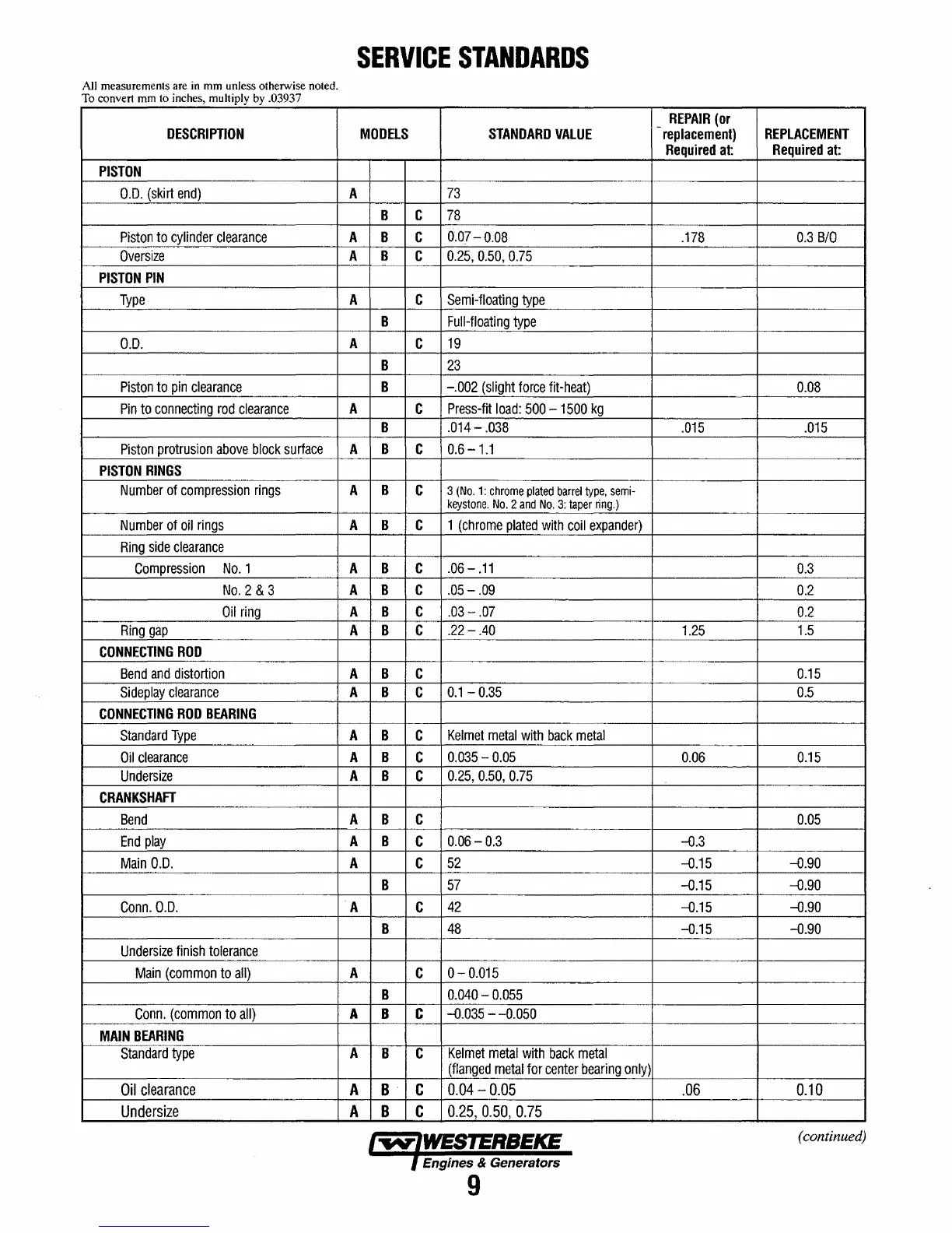Westerbeke W-27A - Component Service Standards (Continued); Piston, Piston Pin, and Piston Rings Standards; Connecting Rod and Bearing Standards; Crankshaft and Main Bearing Standards