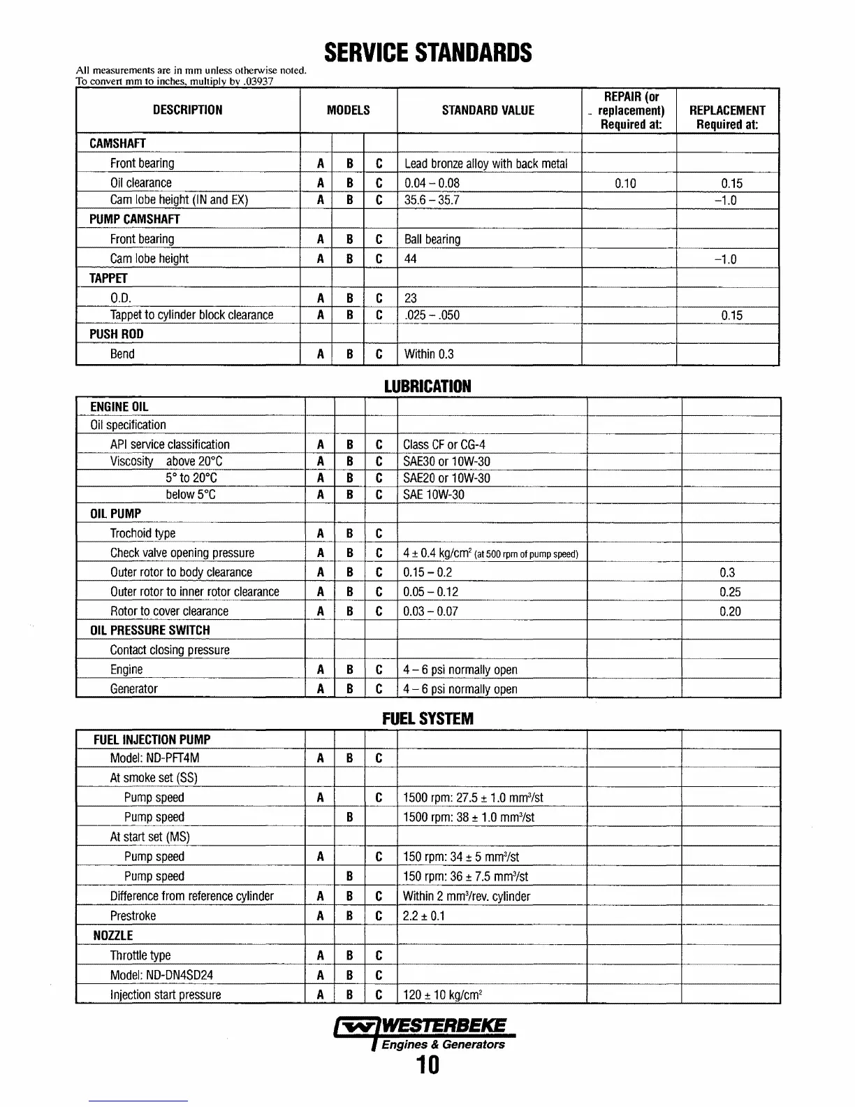 Westerbeke W-27A - Component Service Standards (Continued); Camshaft and Tappet Standards; Lubrication System Standards; Fuel System Standards