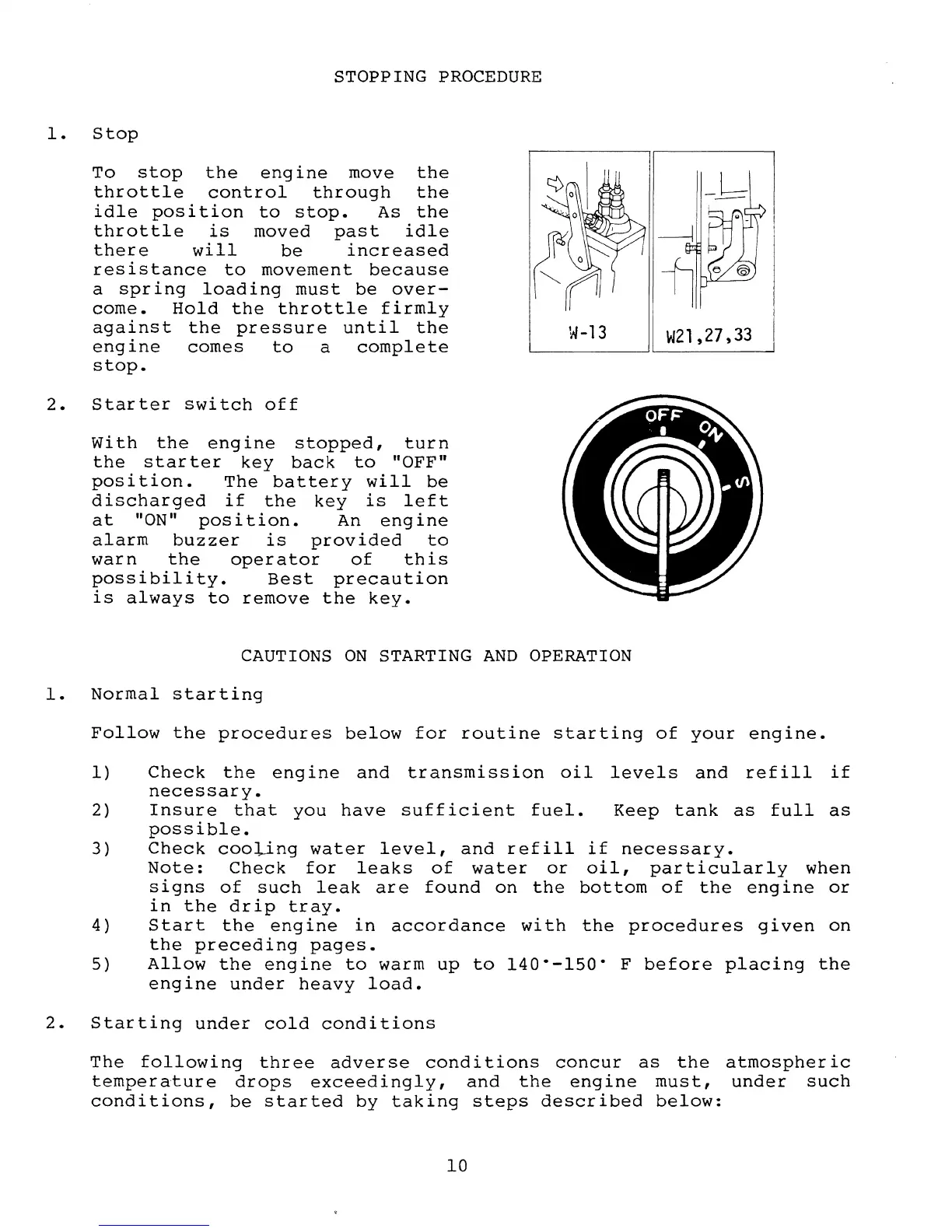 Westerbeke W-33 - STOPPING PROCEDURE; CAUTIONS ON STARTING AND OPERATION; NORMAL STARTING PROCEDURES; STARTING UNDER COLD CONDITIONS
