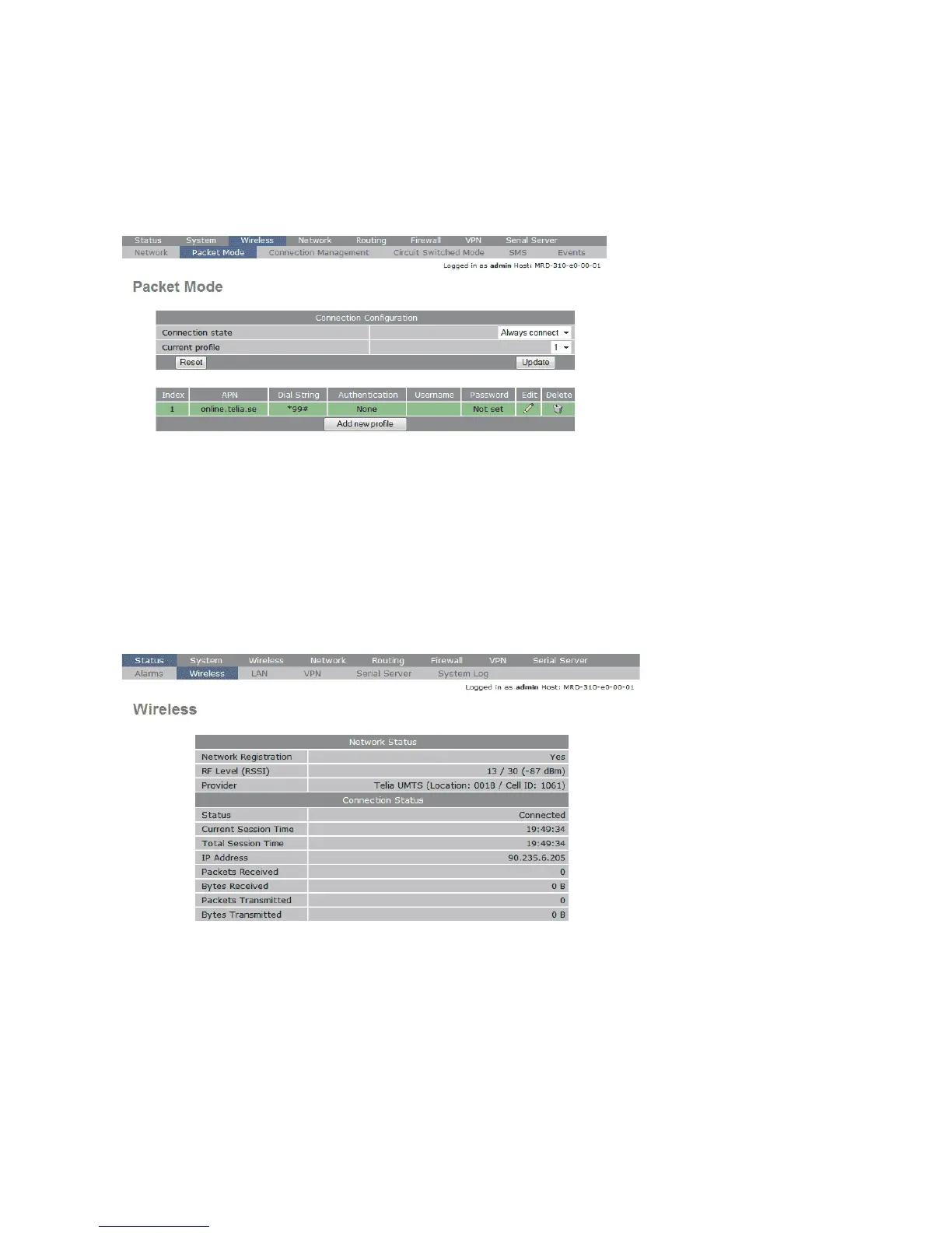 select ”Wireless” from the second level menu. The Wireless status page will be displayed