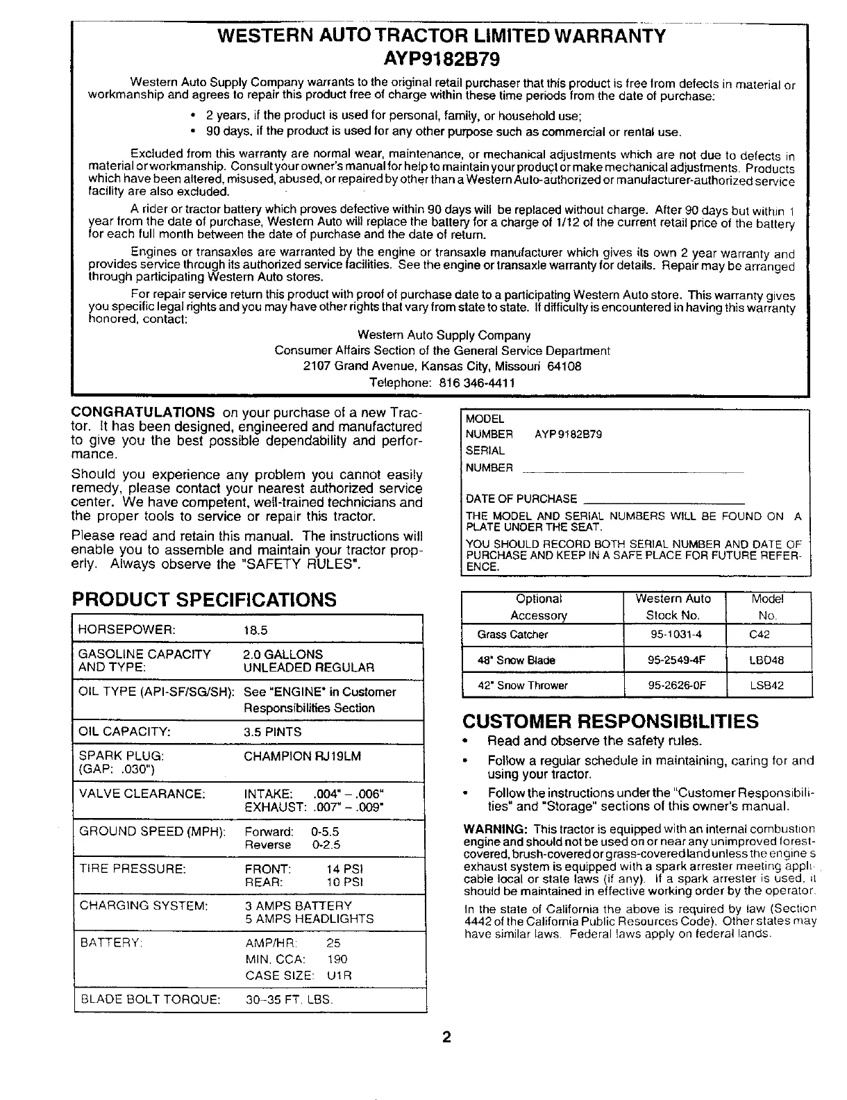 WESTERN AUTO TRACTOR LIMITED WARRANTY
