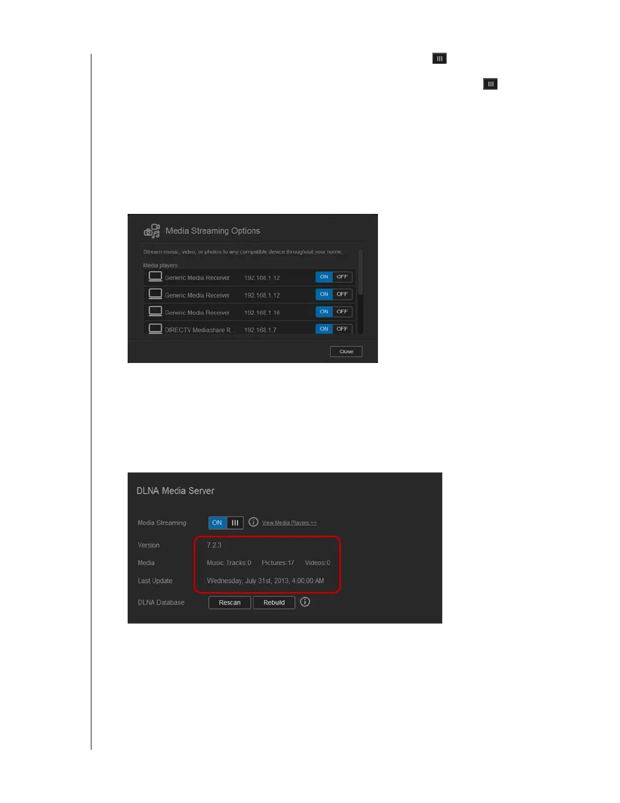 Note: Media Streaming is OFF by default. To enable DLNA, click the toggle button to