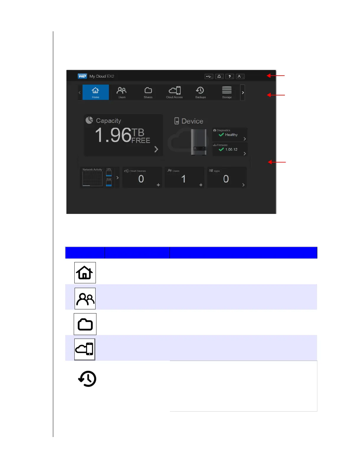 The WD My Cloud EX2 Home page has an information bar at the top right, a navigation icon