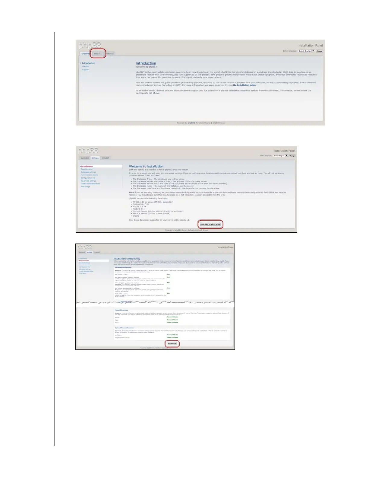 4. Review the phpBB introduction, and then click the Install tab.