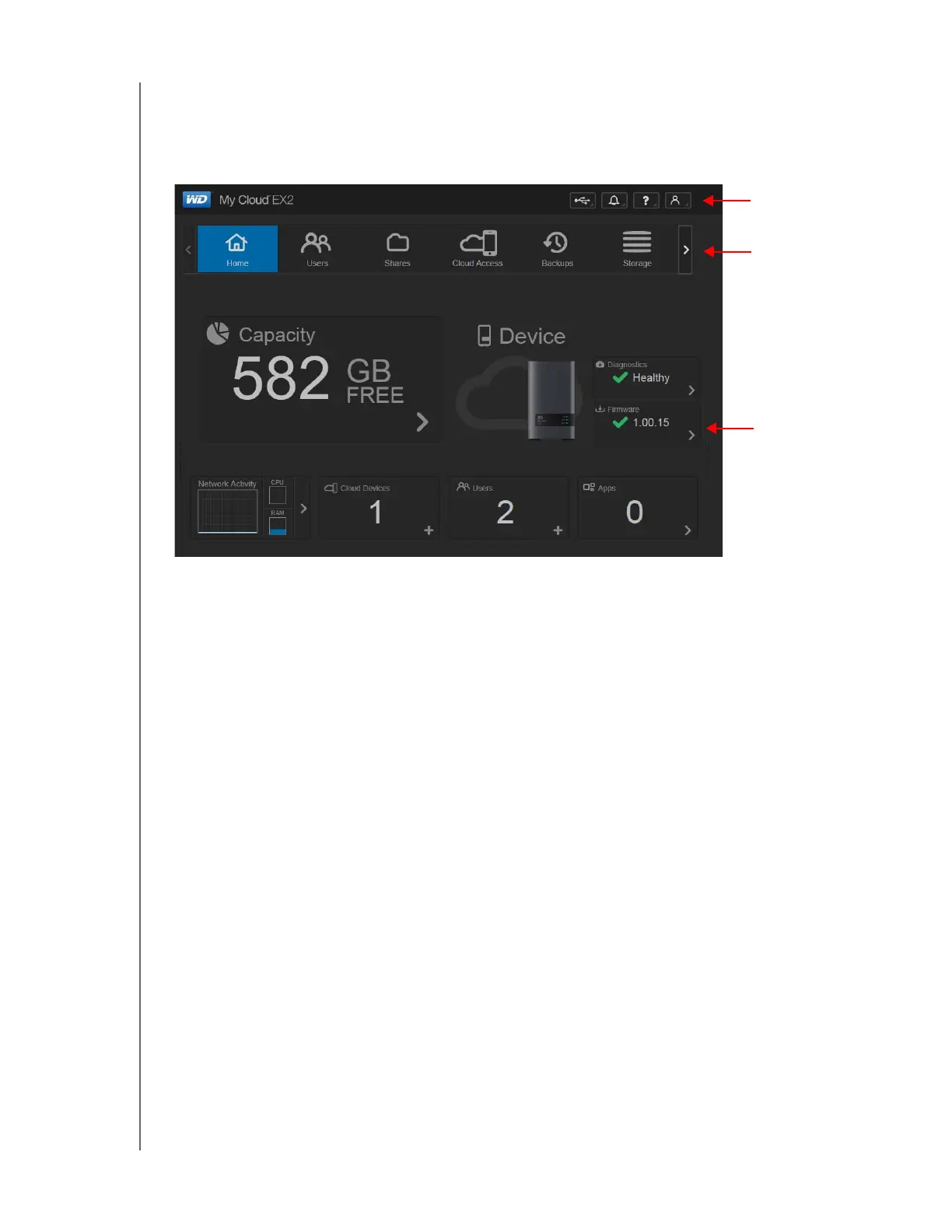 The WD My Cloud EX2 Home page has an information bar at the top right, an navigation