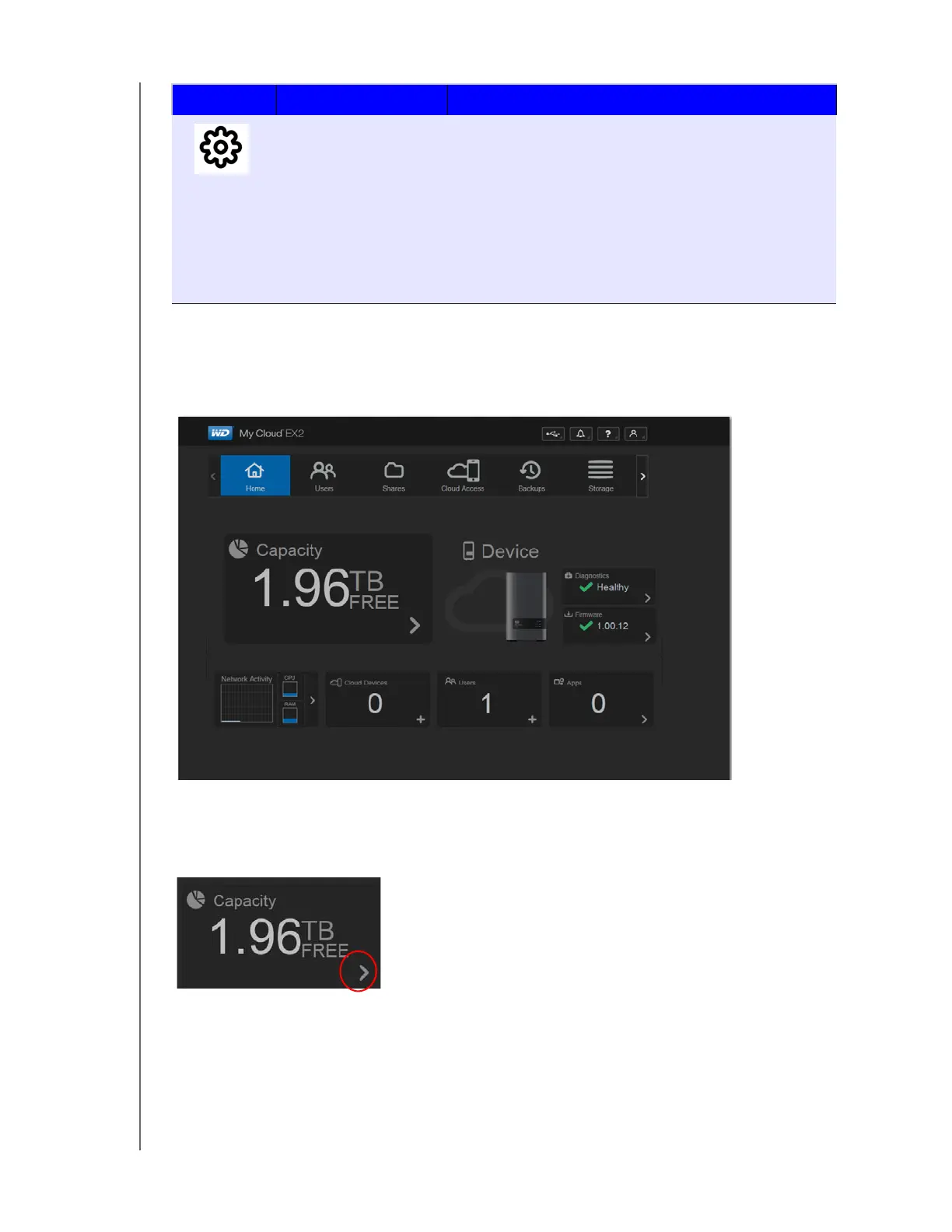 The Capacity panel displays the amount of free storage left on your WD My Cloud EX2