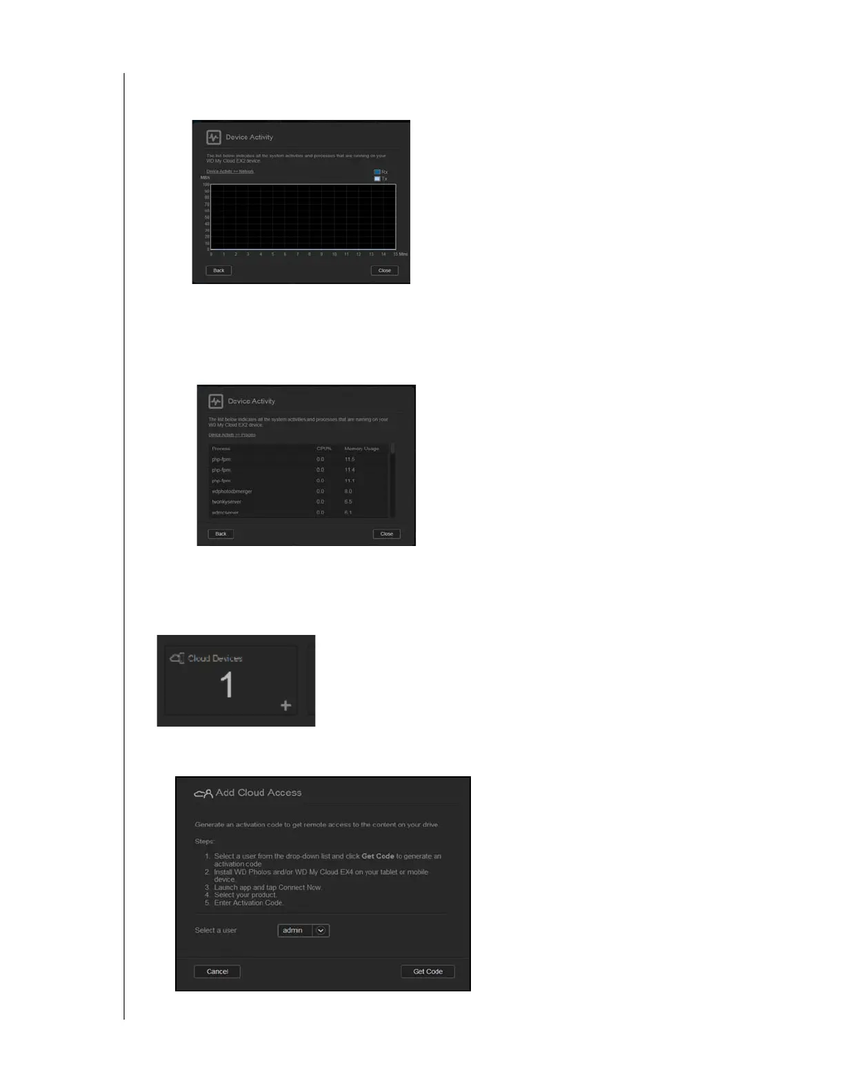 Click Back to return to the Device Activity pane. Click Close to return to the Home