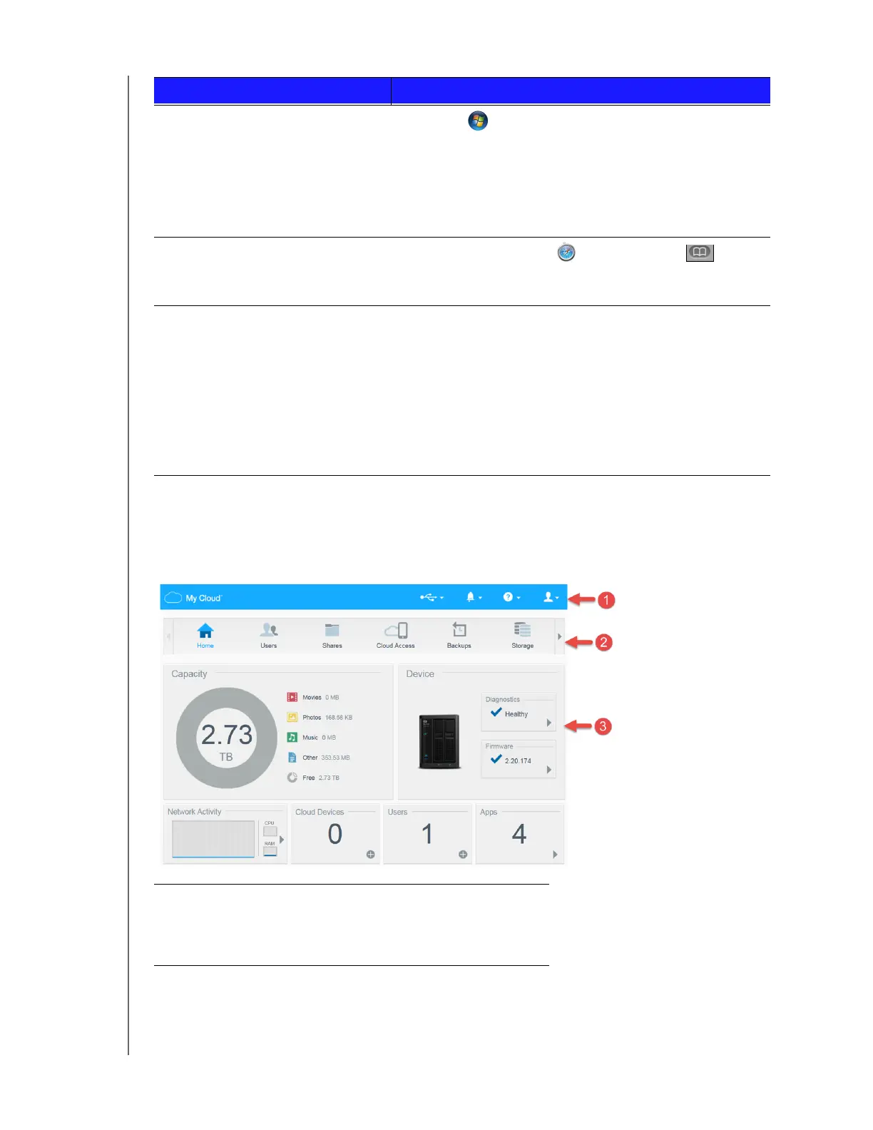 The My Cloud Home page has an information bar at the top, a navigation icon bar across the page,