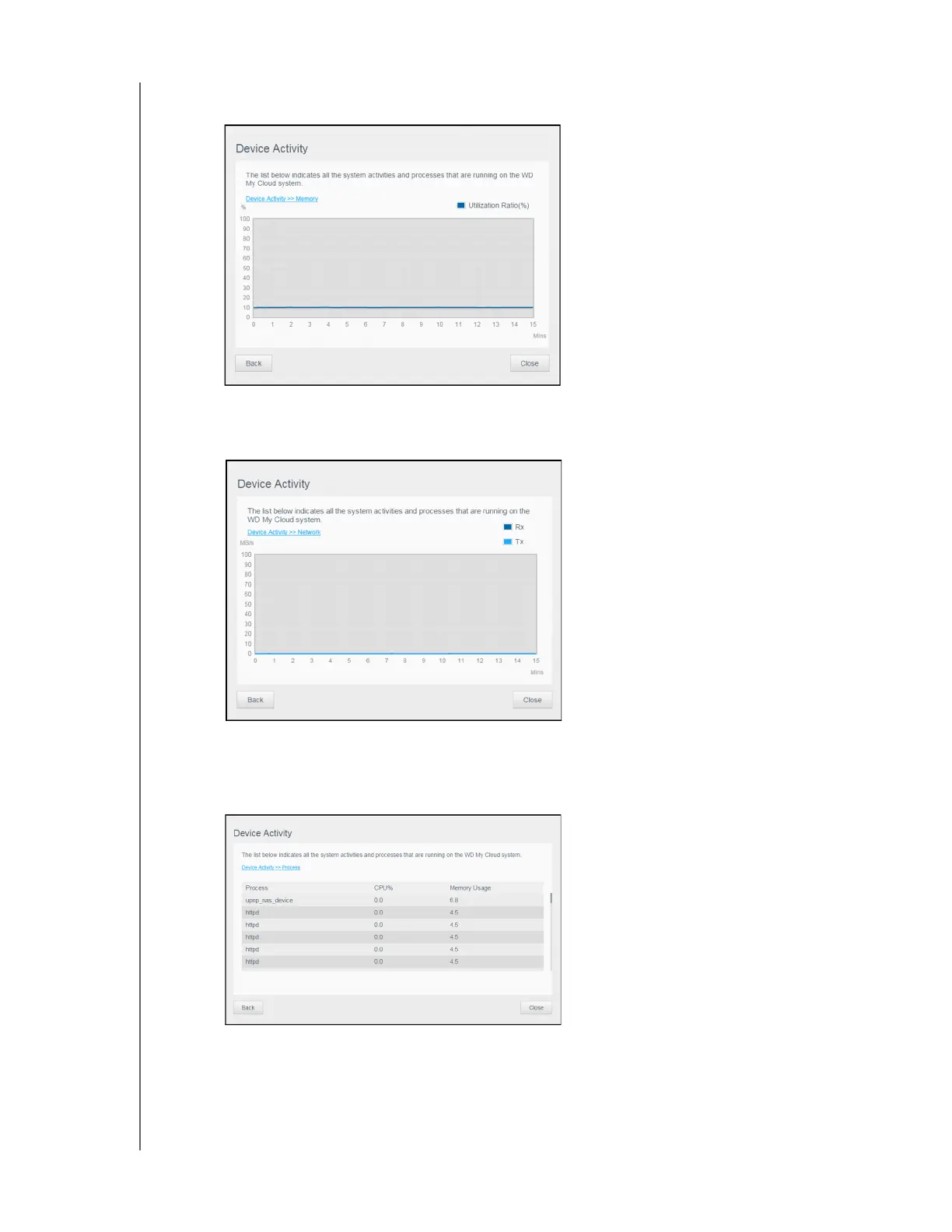 activity. Click Back to return to the Device Activity pane. Click Close to return to the