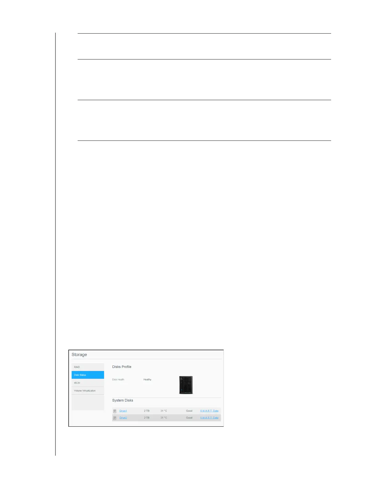 The Disk Status screen identifies the health of the disk drives as well as the status and information