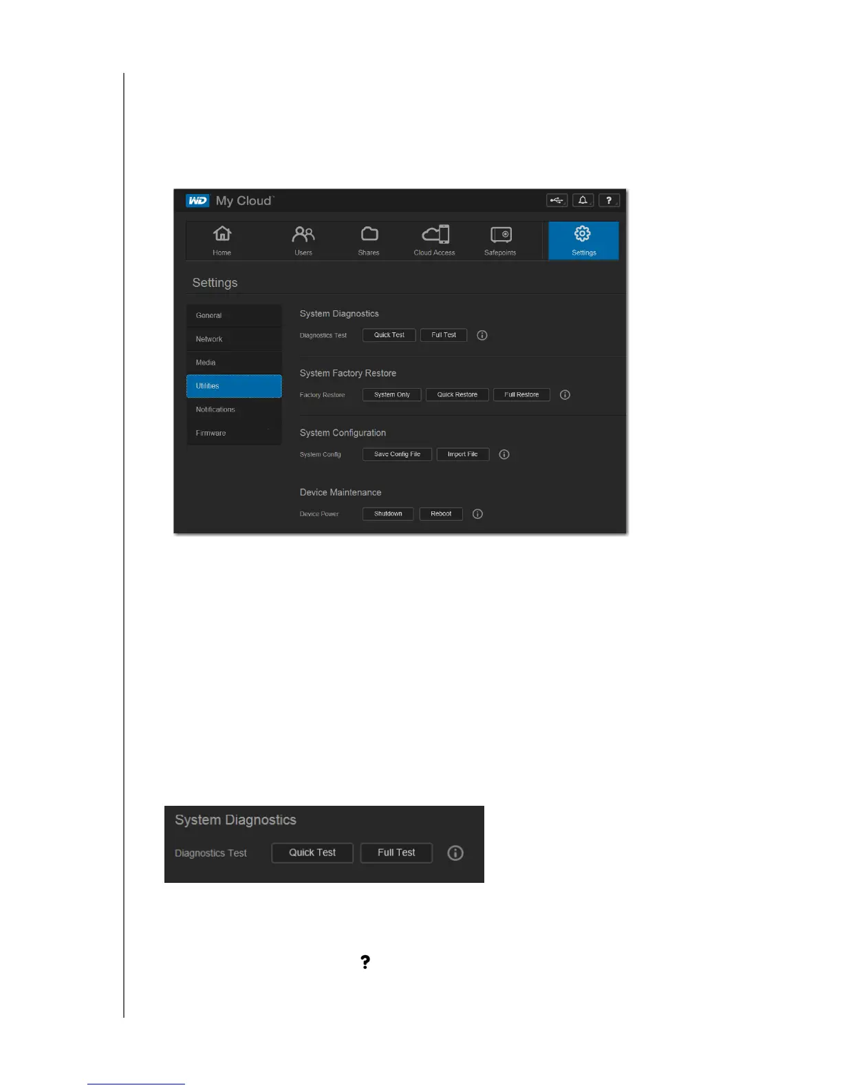 On the Utilities page, you can test the WD My Cloud device and get diagnostic information,