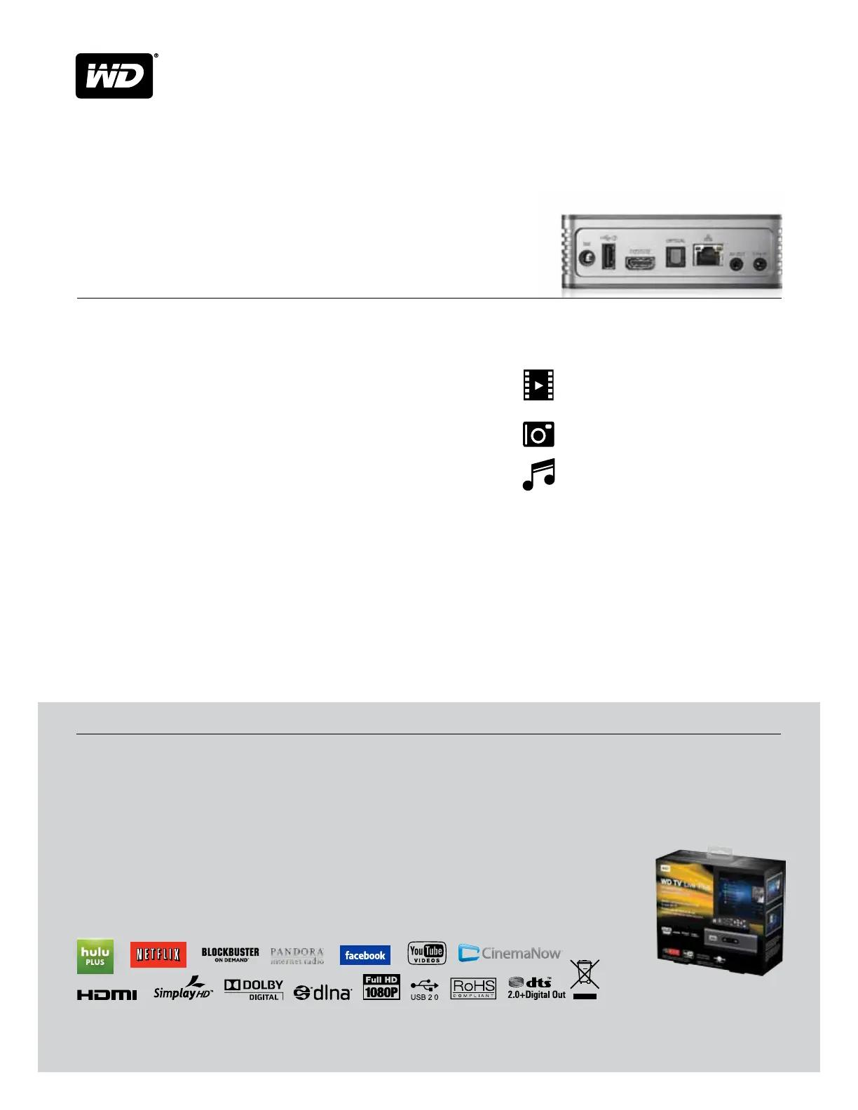 Western Digital, WD, the WD logo, WD TV, and Put Your Life On It are registered trademarks in the U.S. and other countries; WD TV Live is a trademark of Western Digital Technologies, Inc. Other marks may be mentioned herein that belong to other companies. Pictures shown may vary from