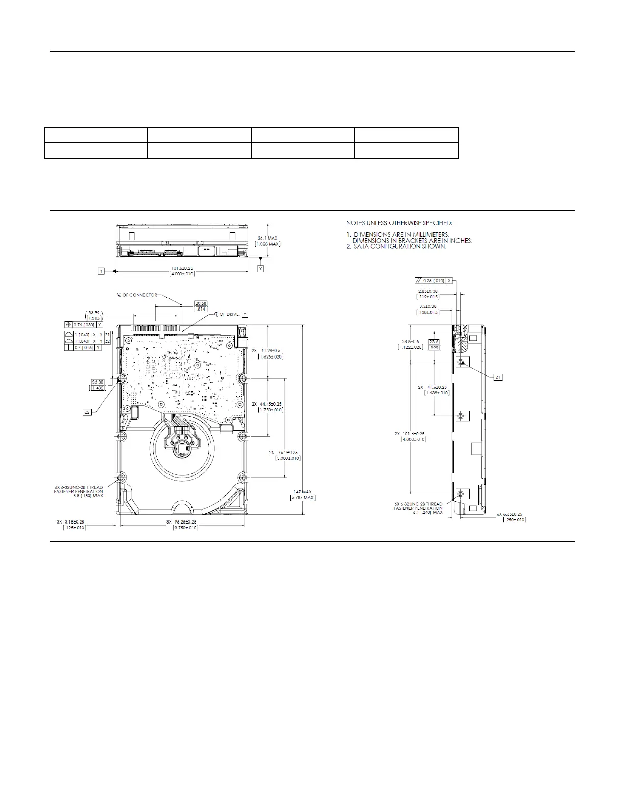 Figure 10 Top, bottom, side views and mechanical dimensions, with connector position (SATA)