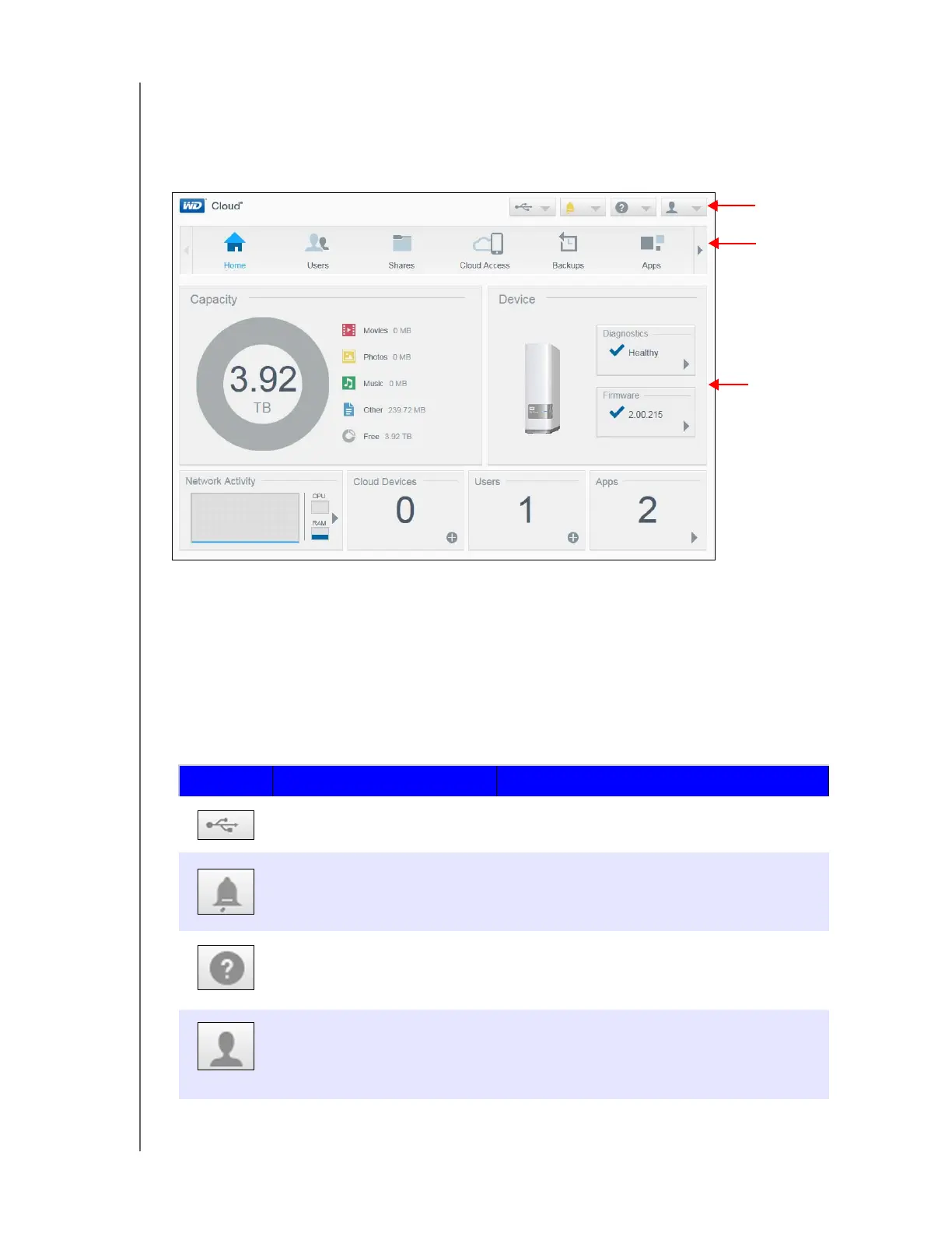 The WD Cloud Home page has an information bar at the top right, a navigation icon bar