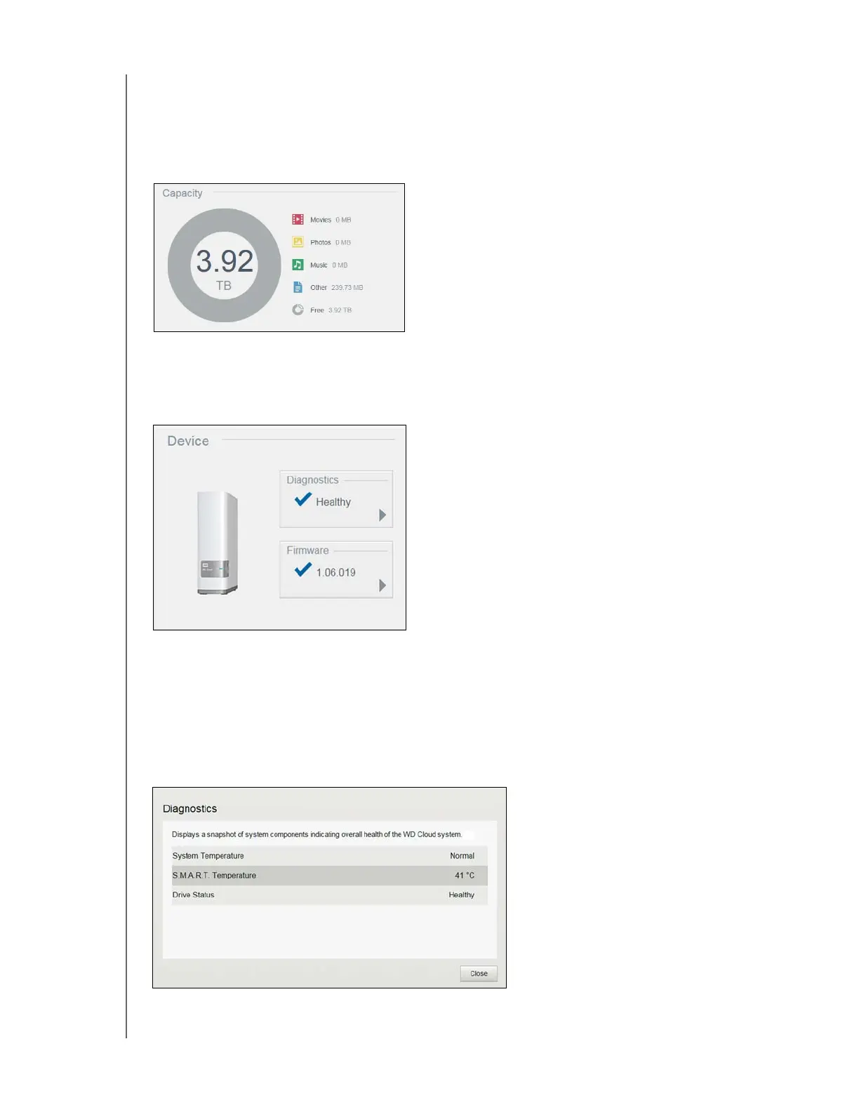 The Capacity panel displays the amount of storage remaining on your WD Cloud device and