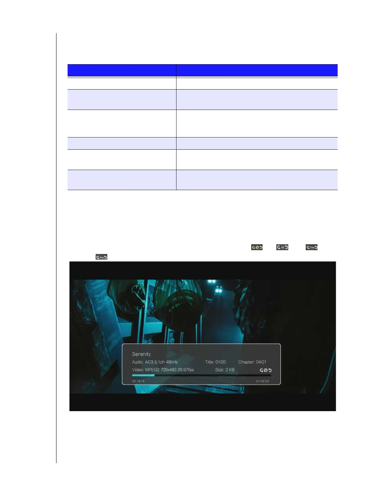 bar, title and chapter info, file size, and repeat option (Off , All ,Title , or