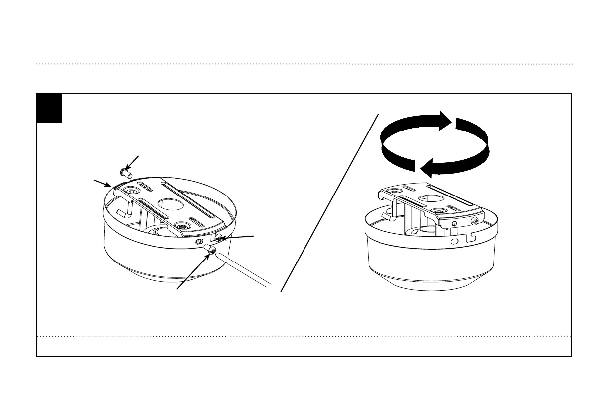 Remove the screws from the two mating holes (2) on the canopy. Loosen (do not remove) the screws in the mating slots (1) on the canopy. Rotate the mounting bracket and remove