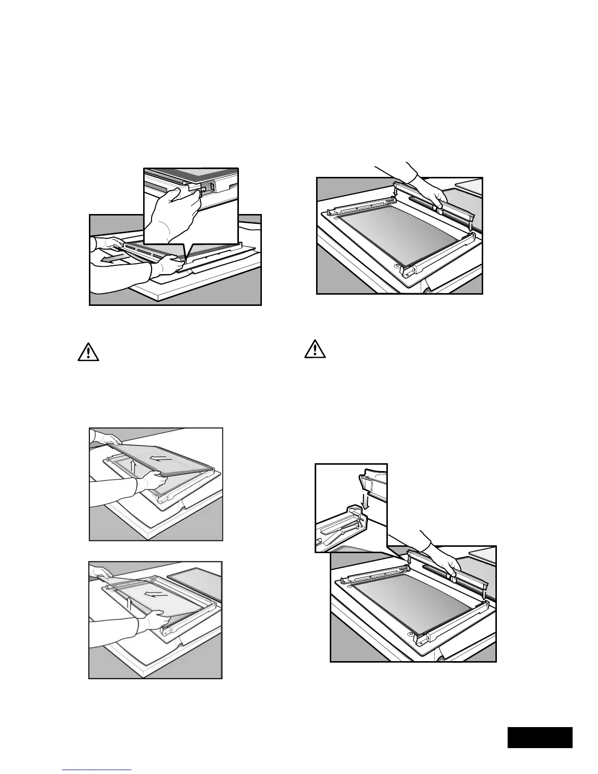 • Lift the black bordered glass panel out of the guide.