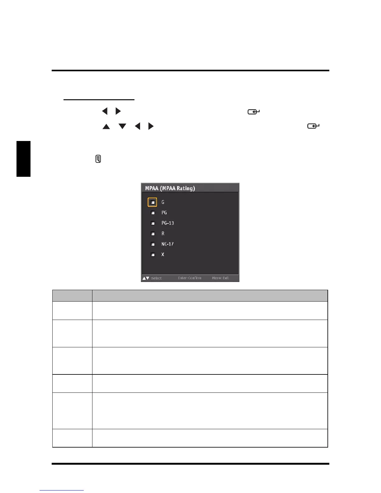 • MPAA Rating: Use this sub-menu to select the ratings of allowable movies.