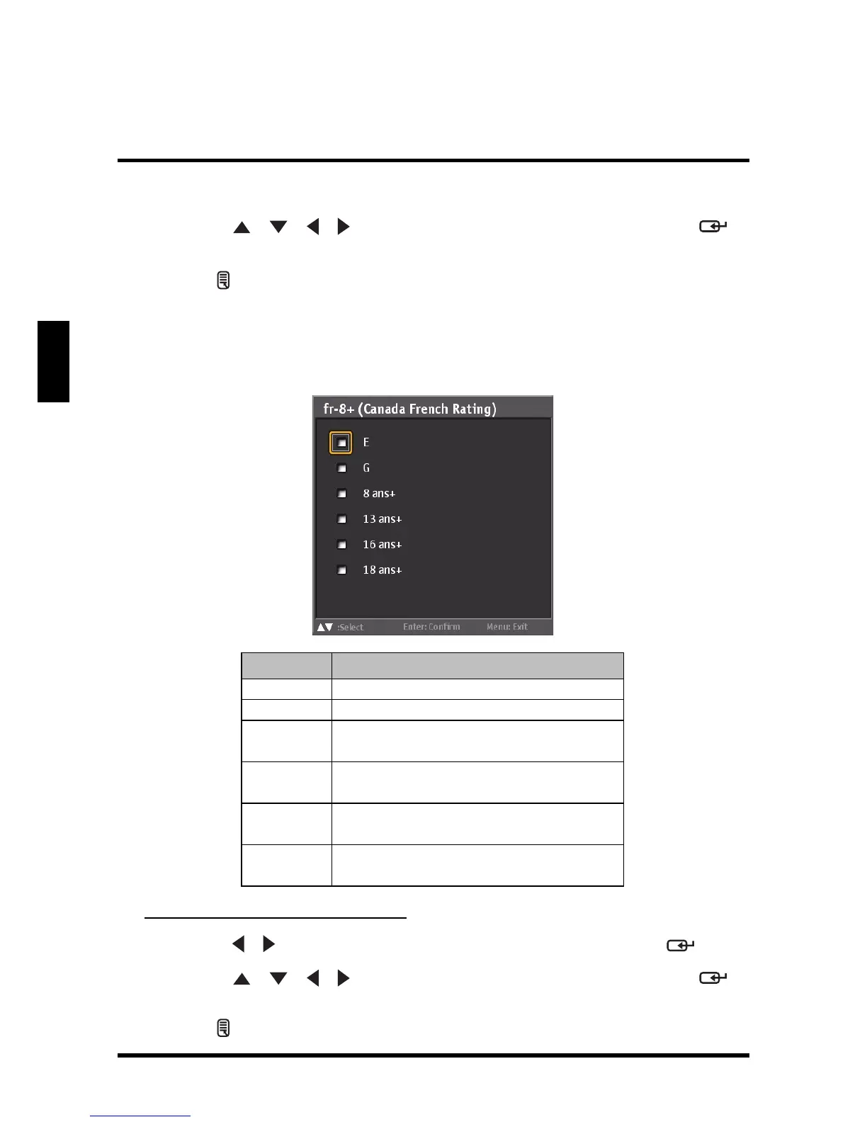 • Canada French: Use this sub-menu to select the ratings of allowable TV