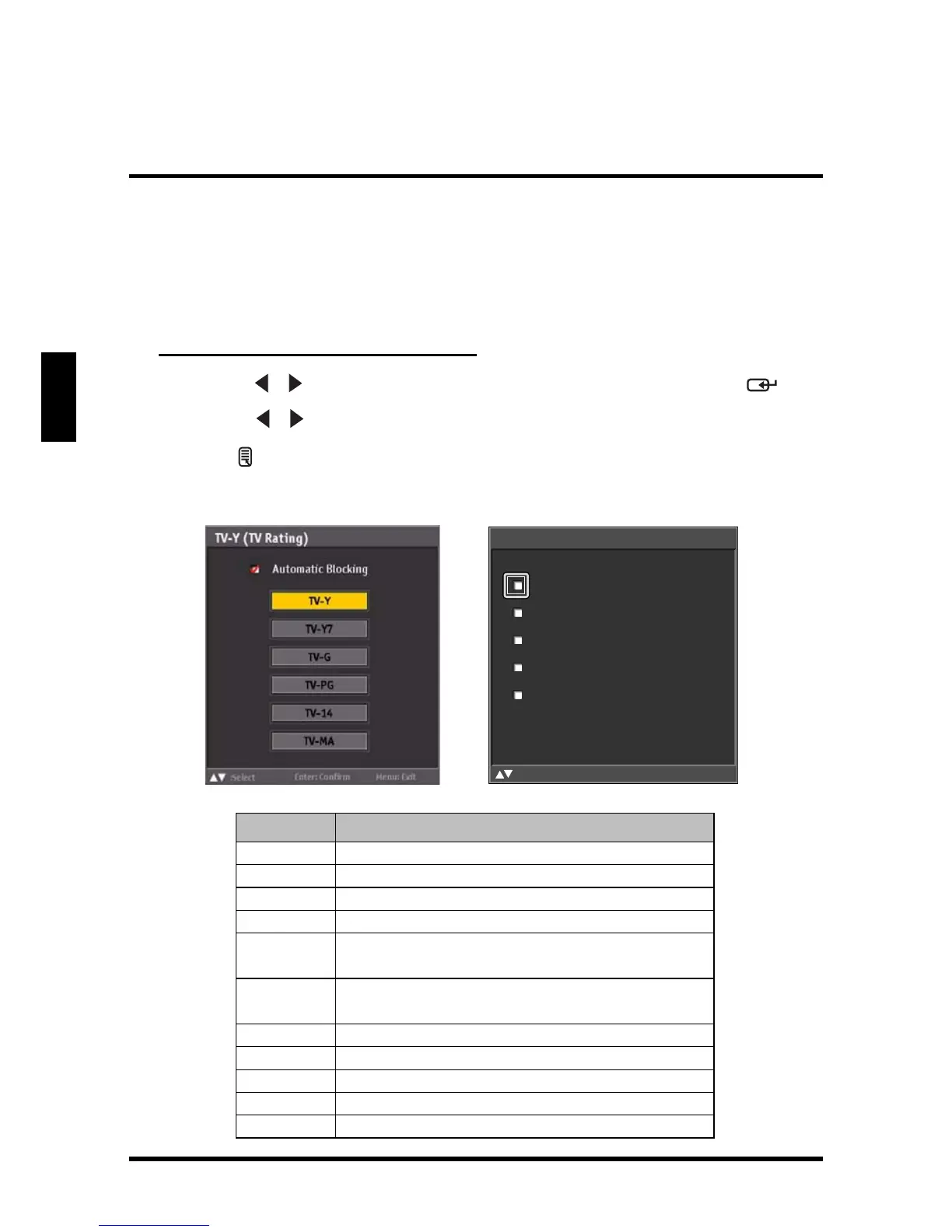 • TV Rating: Use this sub-menu to customize US TV Rating programs.