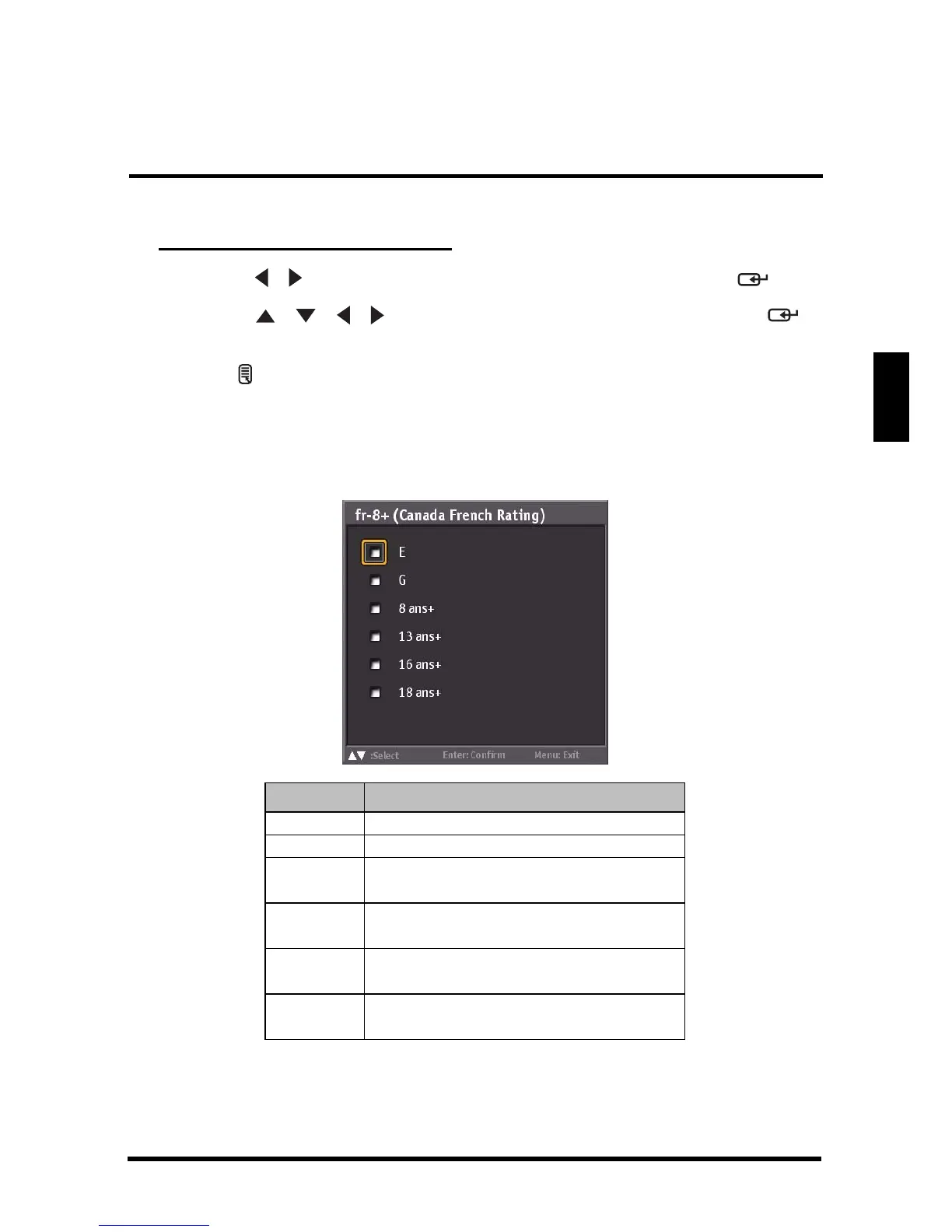 • Canada French: Use this sub-menu to select the ratings of allowable TV