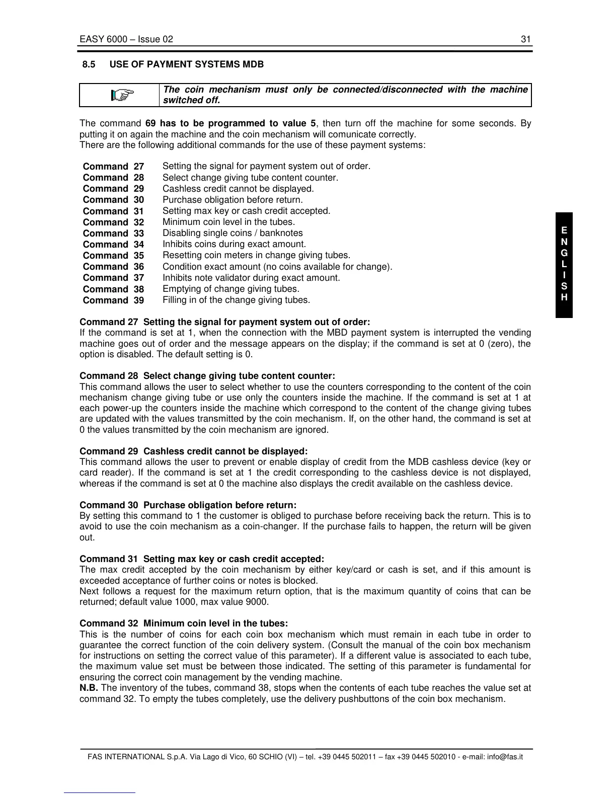 If the command is set at 1, when the connection with the MBD payment system is interrupted the vending